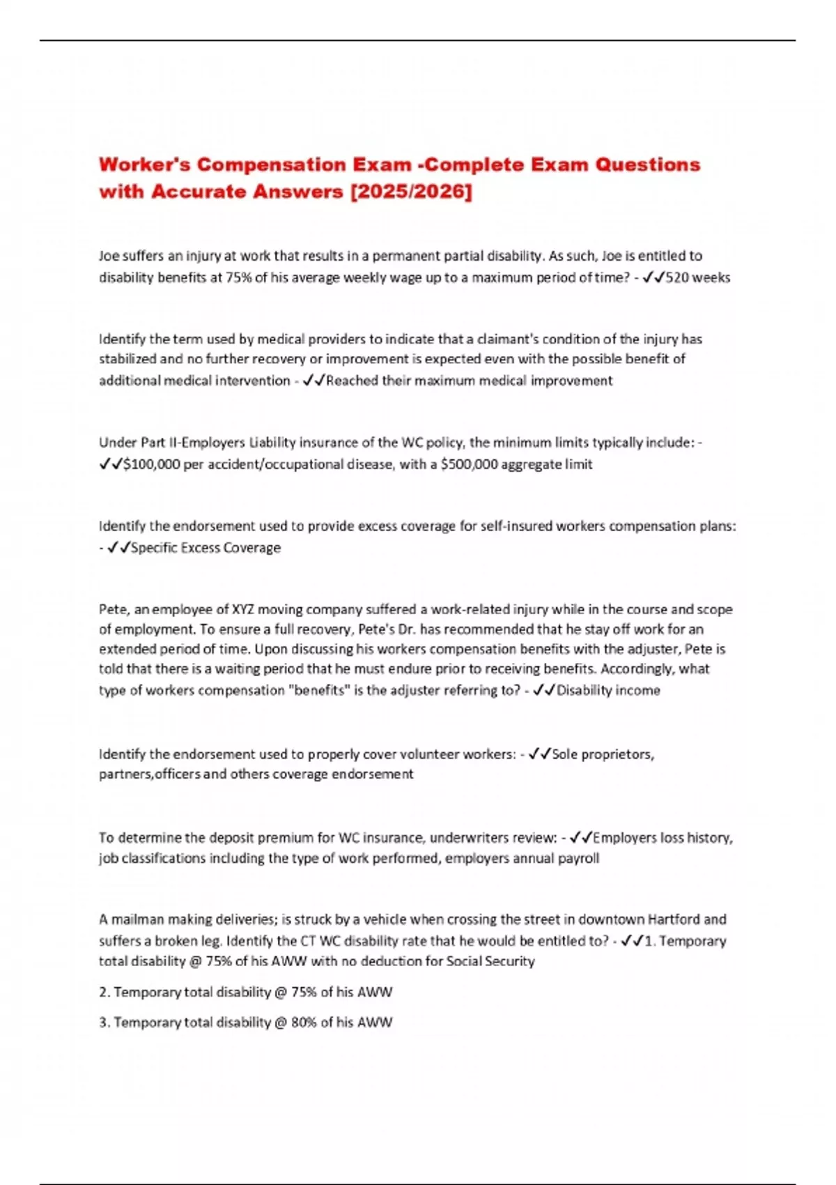 Worker's Compensation Exam -Complete Exam Questions with Accurate Answers [2025/2026]