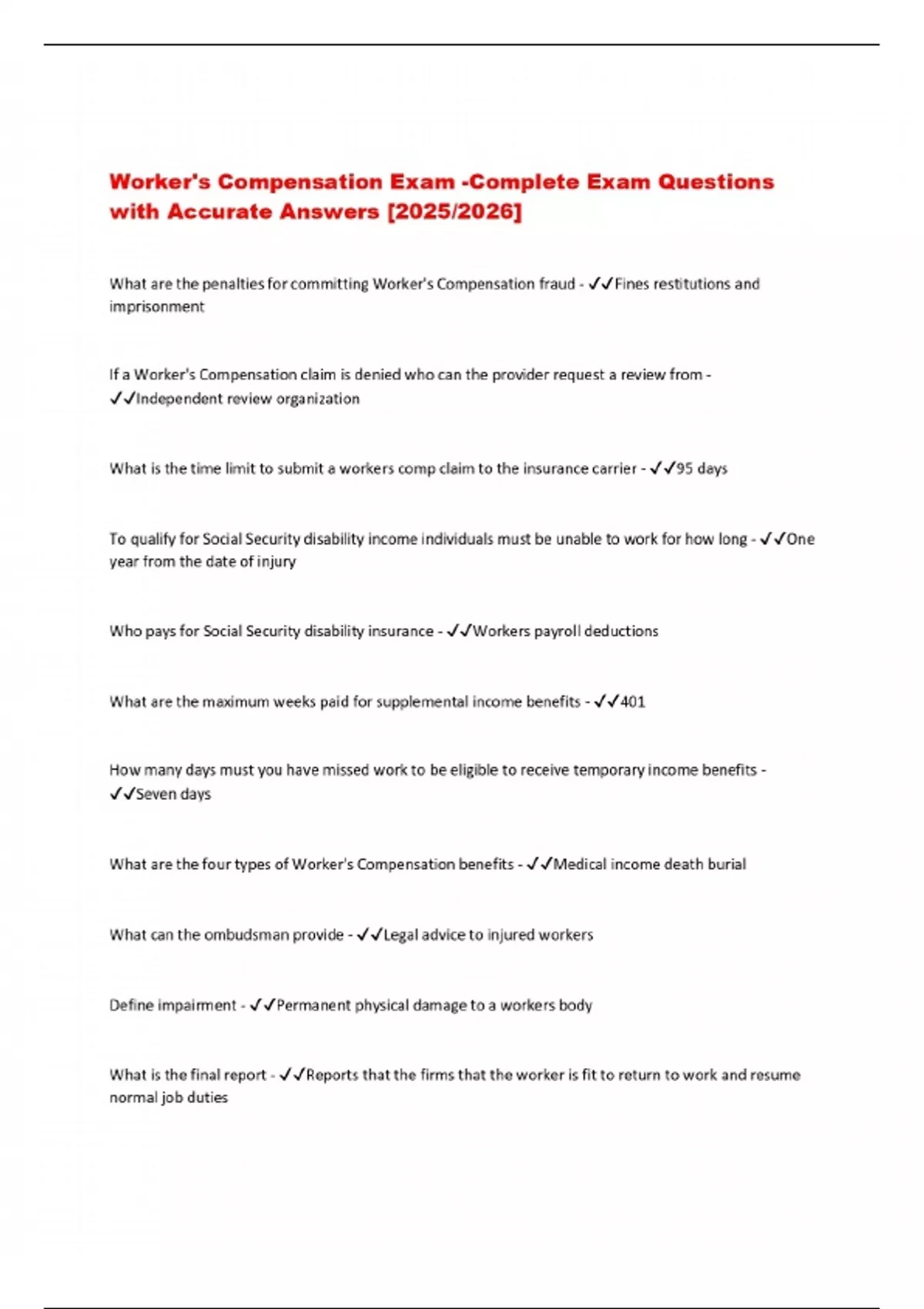 Worker's Compensation Exam -Complete Exam Questions with Accurate Answers [2025/2026]