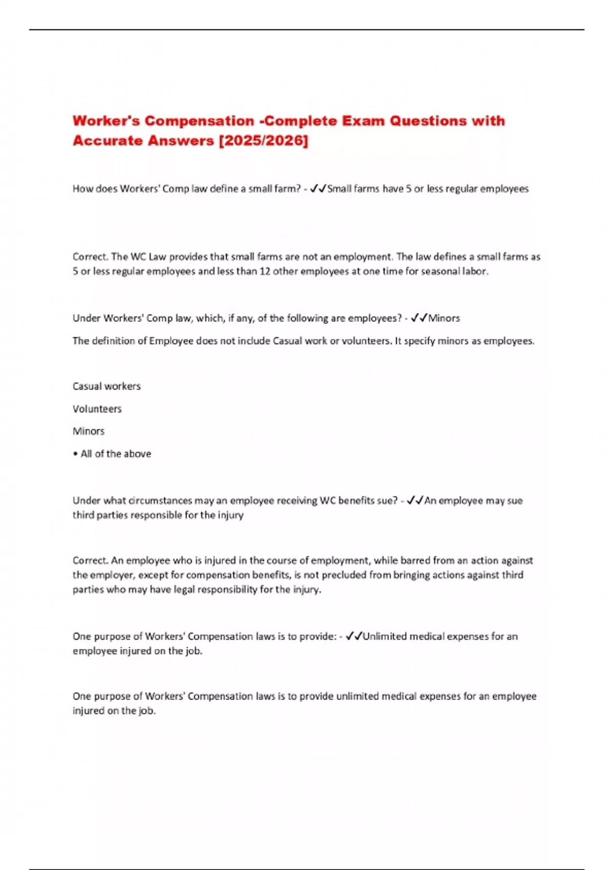Worker's Compensation -Complete Exam Questions with Accurate Answers [2025/2026]