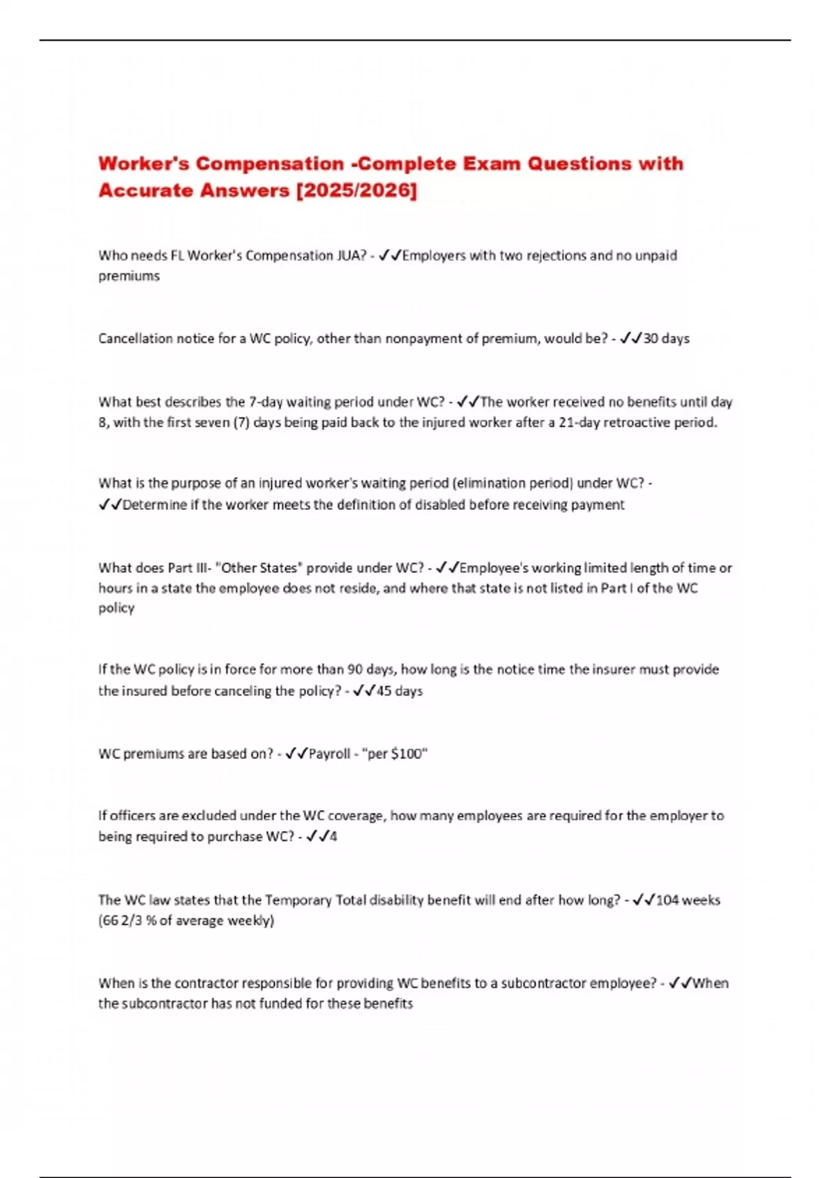 PACKAGE DEAL FOR Workers Compensation Exams 2025/2026 – Verified Questions and Correct Answers