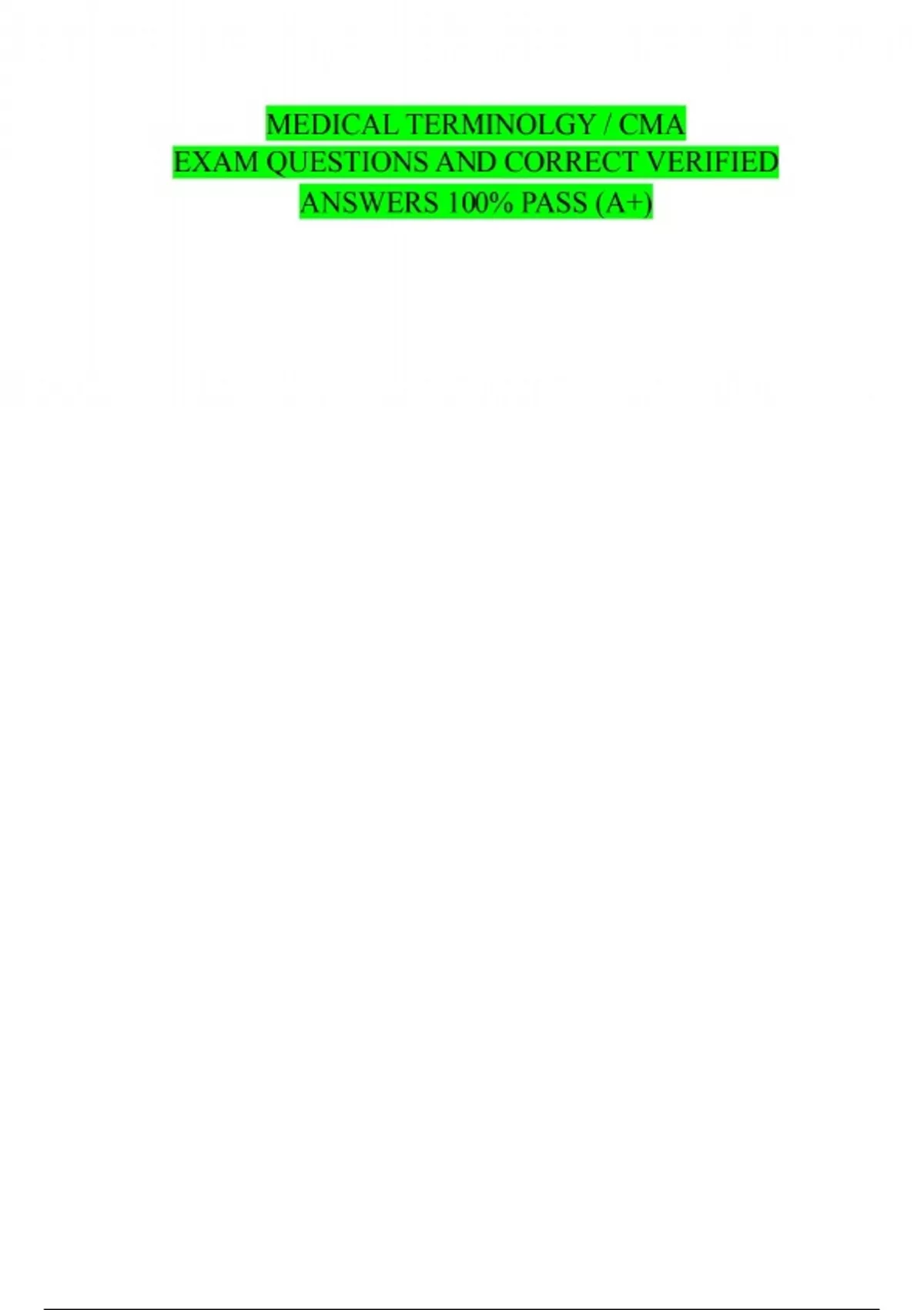MEDICAL TERMINOLGY / CMA EXAM QUESTIONS AND CORRECT VERIFIED ANSWERS 100% PASS (A+) The suffix emia means - Answer blood Medical term for expanding or opening wider is - Answer dilate The abbreviation for urinalysis is - Answer ua The medical term for groups of cells with the same function - Answer tissue The medical term for the basic unit of body structure is - Answer cell The abbreviation for below or low is - Answer hypo The medical term for the time when menstration begins is - Answer menarche