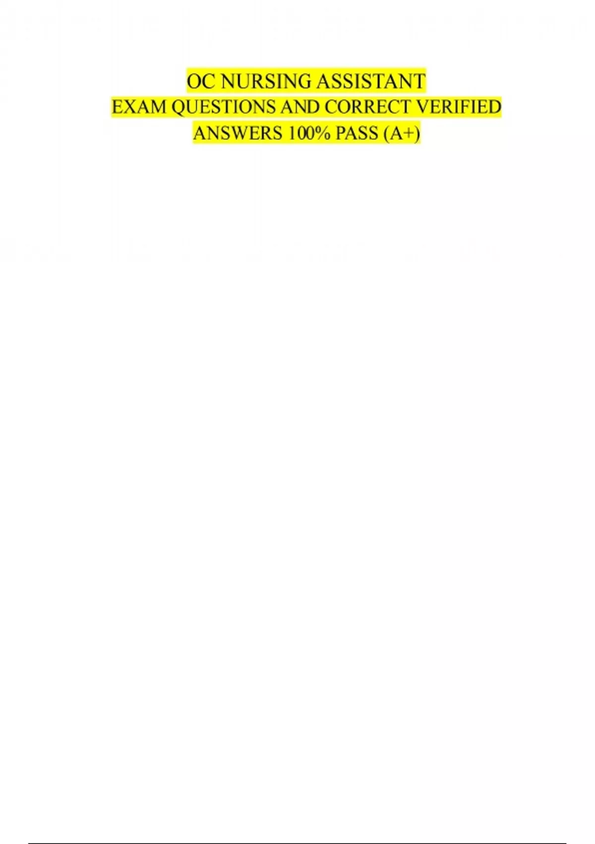 OC NURSING ASSISTANT EXAM QUESTIONS AND CORRECT VERIFIED ANSWERS 100% PASS (A+) Buckley is a nursing assistant. His goal is to attend four nursing seminars to help earn more credibility with his coworkers. Which best describes his goal? - Answer His goal is professional and relevant. Christopher works in administration at the hospital. He wants to do something that will make him feel proud and accomplished. Christopher gives himself a goal. Next month, he wants to run a marathon that is more than 26 miles. He will start an exercise program, but he has done no other form of exercise before. - Answer His goal is personal and time bound. To portray a positive image while caring for patients, nursing assistants must - Answer have clean, neat hair Which is another name for a leukocyte? - Answer white blood cell A nursing assistant reading a patient chart noticed that the patient was diagnosed with bronchitis. Using a knowledge of prefixes, root words, and suffixes, the nursing assistant knew bronchitis is - Answer an inflammation of the air passages to the lungs. A nursing assistant is following a care plan and regularly taking the temperature of a patient who has had a fever for the last twenty-four hours. Which skills is the nursing assistant using to implement the plan? - Answer surveillance skills Lita, a nursing assistant, just ended a twelve-hour shift. She has to work again in four hours to cover a twelve-hour shift for another nursing assistant. What should she do during her time off to best maintain her well-being? - Answer get some sleep Understanding directions given as if/then statements is important while caring for patients because nursing assistants must be able to - Answer follow different directions in different situations. Pia wants to ensure her name stays on the nursing assistant registry. Which requirement must be met for her to do this? - Answer eight hours of paid nursing assistant duties every twenty-four months