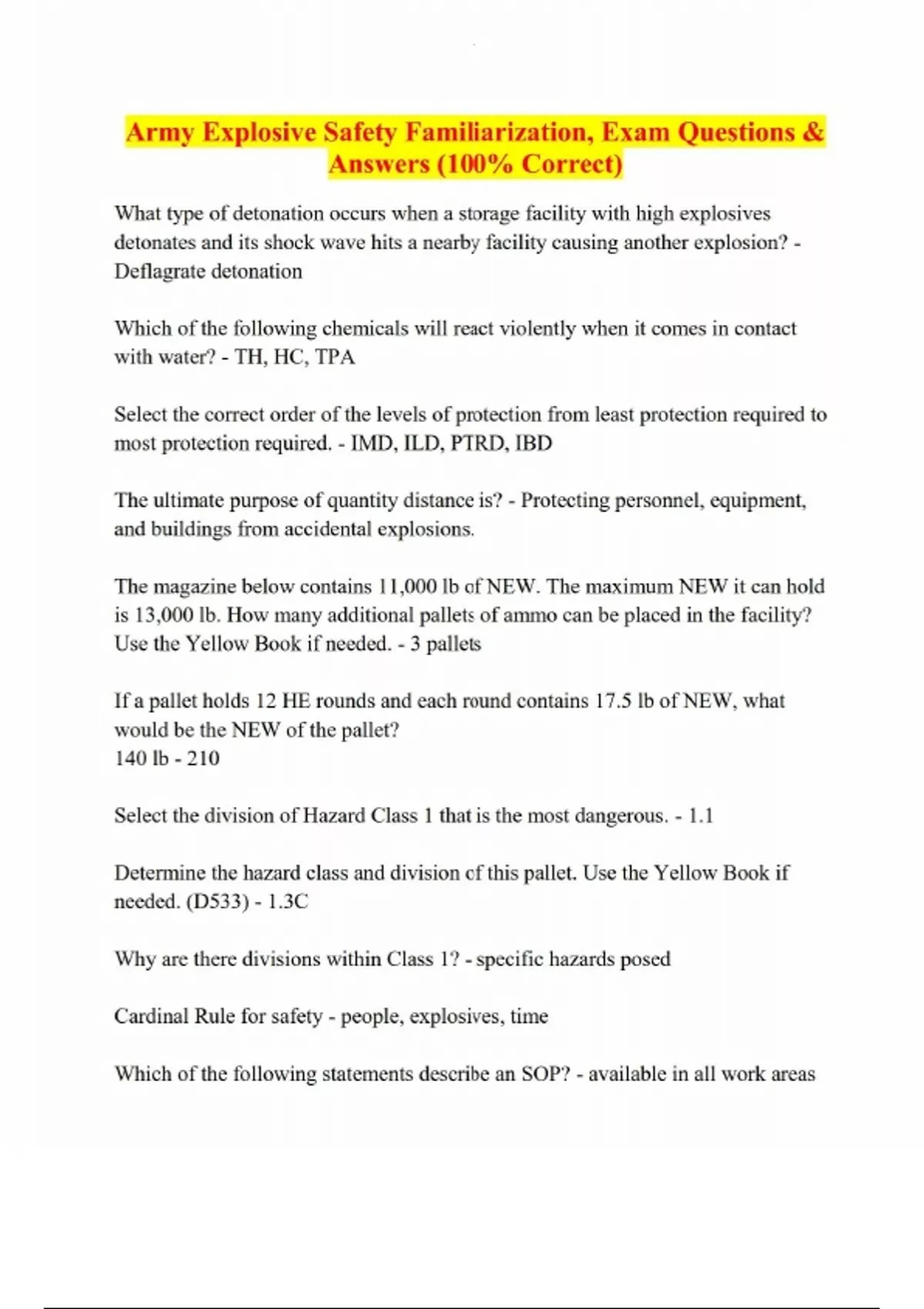 Army Explosive Safety Familiarization Exam Questions & Answers 100 Correct