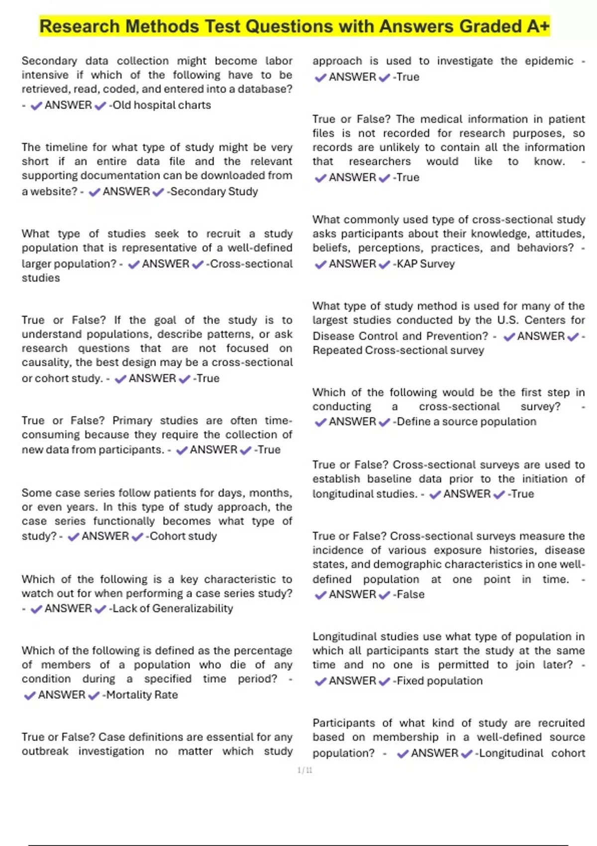 1 / 11 Research Methods Test Questions with Answers Graded A+ Secondary data collection might become labor intensive if which of the following have to be retrieved, read, coded, and entered into a database? - ANSWER -Old hospital charts The timeline for what type of study might be very short if an entire data file and the relevant supporting documentation can be downloaded from a website? - ANSWER -Secondary Study What type of studies seek to recruit a study population that is representative of a well-defined larger population? - ANSWER -Cross-sectional studies True or False? If the goal of the study is to understand populations, describe patterns, or ask research questions that are not focused on causality, the best design may be a cross-sectional or cohort study. - ANSWER -True True or False? Primary studies are often time- consuming because they require the collection of new data from participants. - ANSWER -True Some case seri