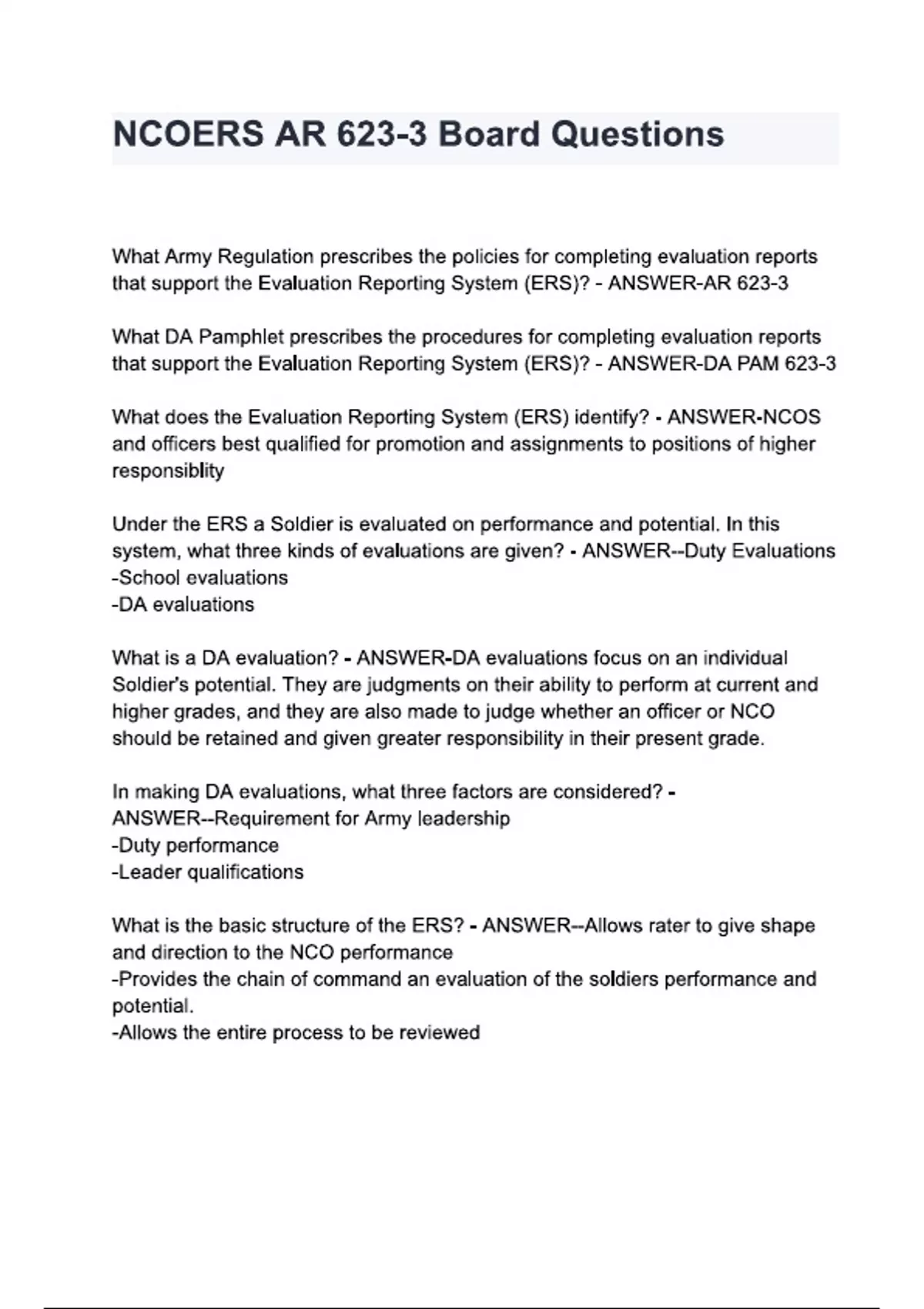 NCOERS AR 623-3 Board Questions and answers