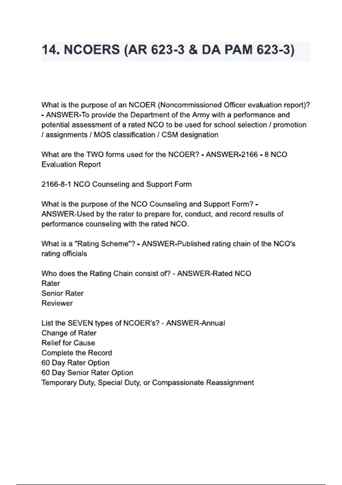 14. NCOERS (AR 623-3 & DA PAM 623-3) questions and answers
