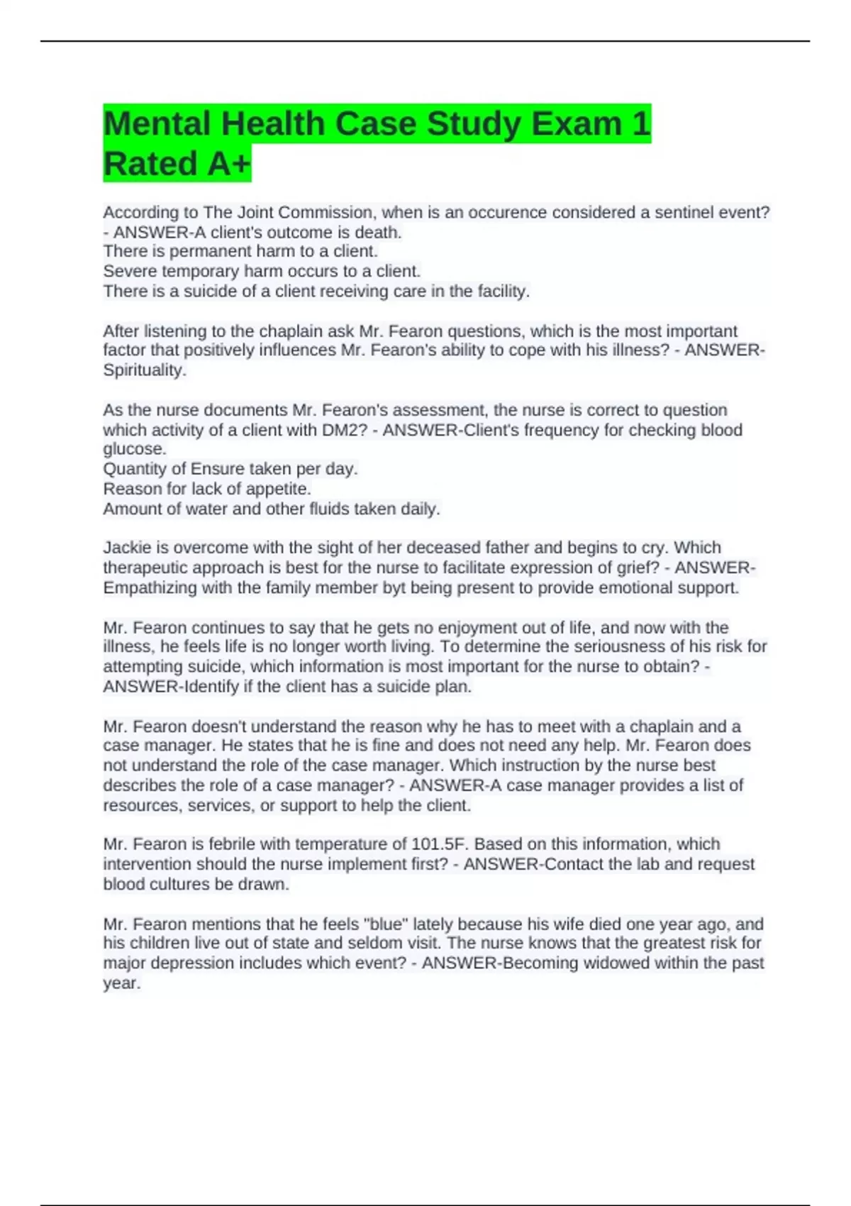Mental Health Case Study Exam 1 Rated A+