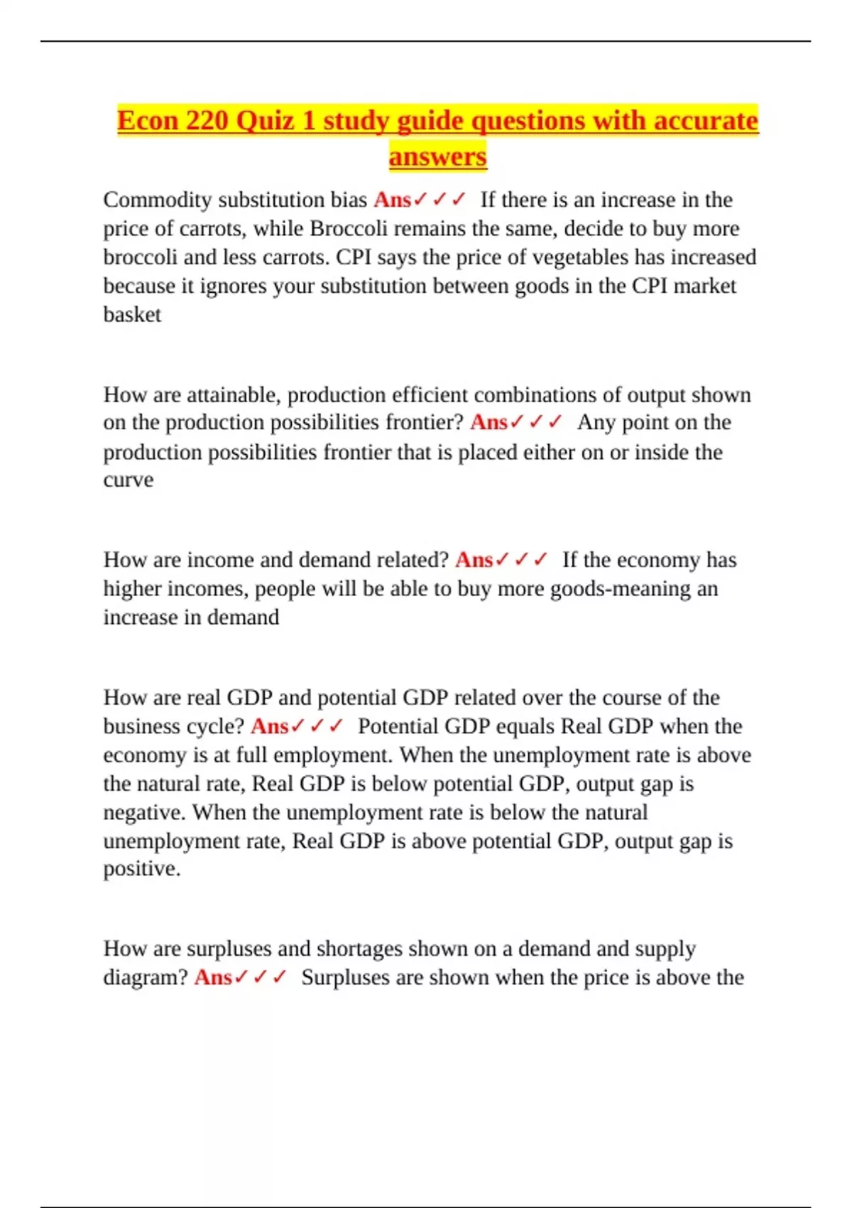 Econ 220 Quiz 1 study guide questions with accurate