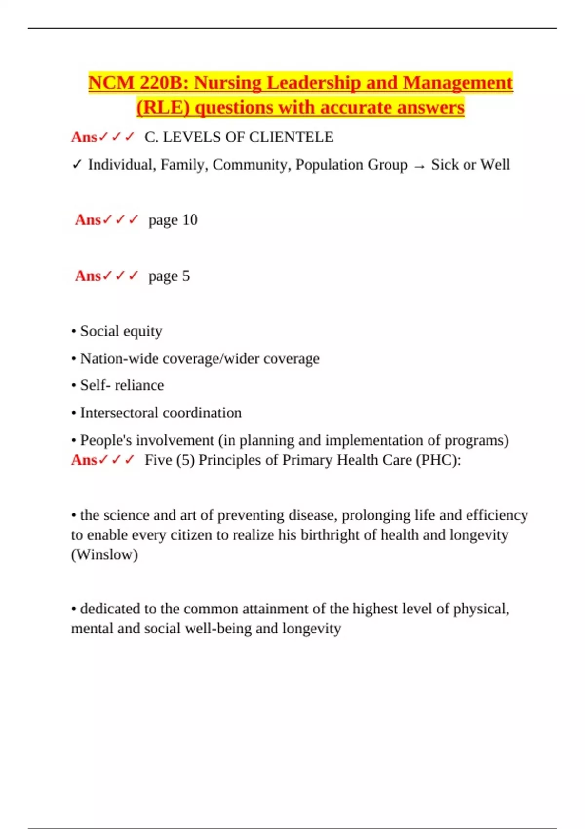 This document provides a comprehensive collection of correctly answered questions for NCM 220B, focusing on nursing leadership, public health principles, and community health