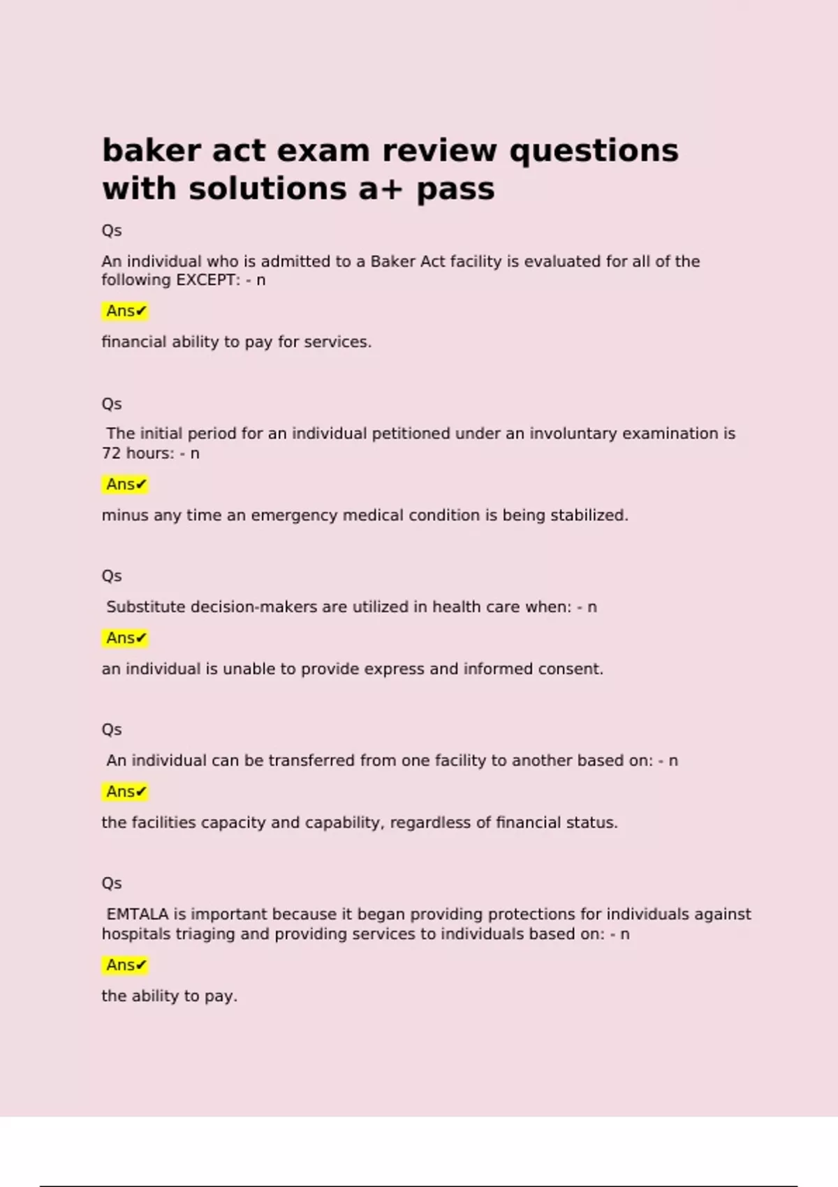 baker act exam review questions with solutions a+ pass Qs An individual who is admitted to a Baker Act facility is evaluated for all of the following EXCEPT: - n Ans financial ability to pay for services. Qs The initial period for an individual petitioned under an involuntary examination is 72 hours: - n Ans minus any time an emergency medical condition is being stabilized. Qs Substitute decision-makers are utilized in health care when: - n Ans an individual is unable to provide express and informed consent.