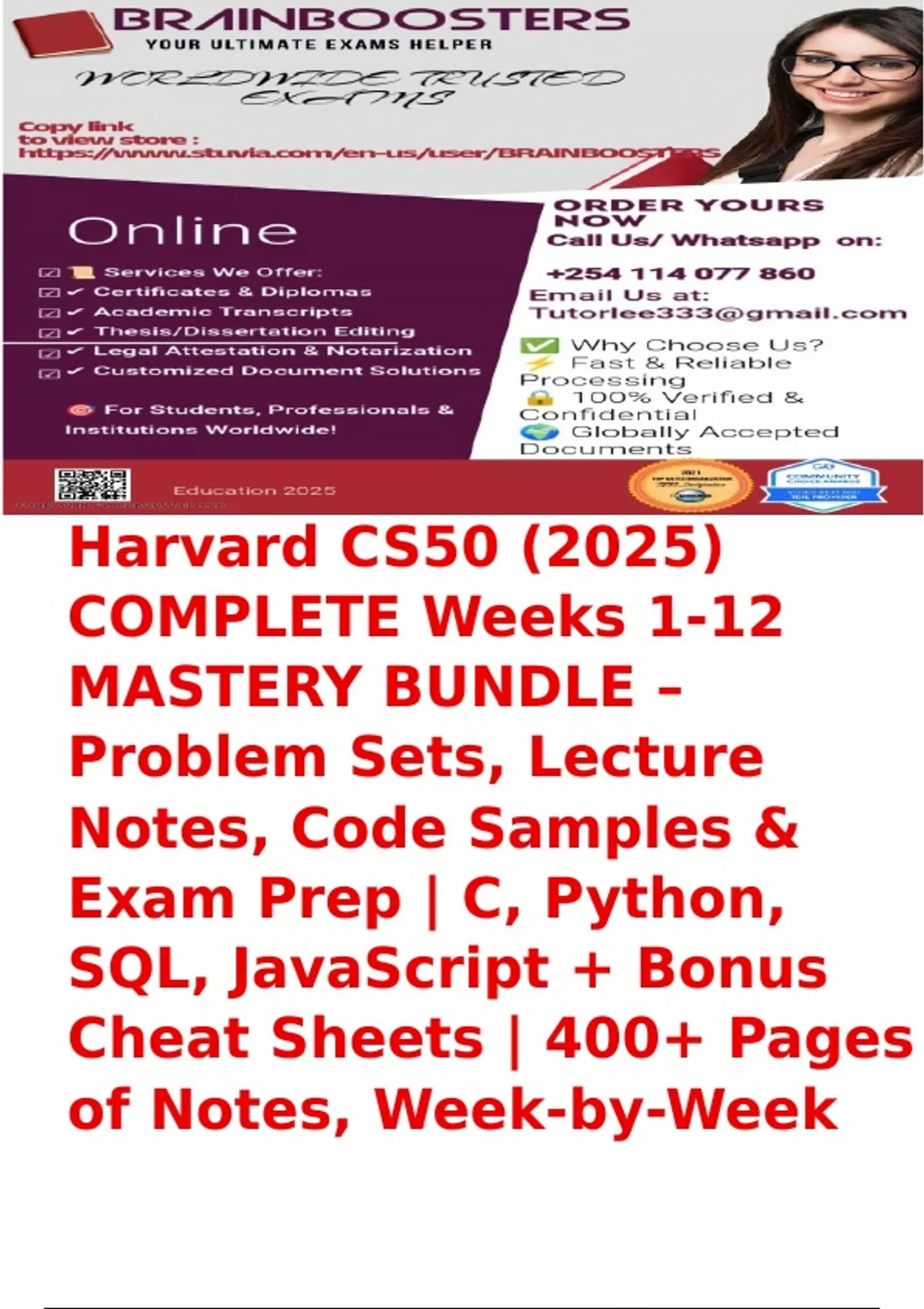 Harvard Computer Science (CS50) (2025) | COMPLETE Weeks 1-12 MASTERY BUNDLE | Problem Sets, Lecture Notes, Code Samples & Exam Prep | C, Python, SQL, JavaScript + Bonus Cheat Sheets | 400+ Pages of Notes, Week-by-Week Cheat Codes, Cybersecurity Labs & AI Implementation Examples + Expert Rationales | GUARANTEED SUCCESS NEED THIS EXAM? I HAVE IT! Instant Download | Trusted by Students Accurate & Verified for Your Course WE ALSO OFFER HOMEWORK AND ASSIGNMENT HELP AND BYPASS TO PROCTORED EXAMS Email: : COPY LINK TO VIEW STORE #StudentLife #viraltikt #testbank #exams #university #exam #viral_video #cpa #examtiktok #examready #Fyp #fyyyyyyyyyyyyyyyy #fyy #exam #examtok #studytok#studytokuk #studytok #studytoker #PROCTOR #proctoredexam #proctoredexambypass #studygram #studyvlog #studyingermany #studyingmotivation #studyingkorean #collegestudent #collegeexam #studytoks #student #studentsectionsauce #studentsection #studentsoftiktok #asmrmedicalexam #universitystudent #ExamMaterials #StudyNotesForSale #BuyStudyGuides #ExamHelp #SellingNotes #DiscountStudyMaterials #LearnOnTikTok #EduTok #StudentLife #BackToSchool2025 #ExamTime #StudyTok #TikTokEducation #MathExams #ScienceExams #HistoryExams #EnglishExams #CollegeExams #HighSchoolExams #MCATPrep #SATPrep#NCLEXReview #examprep #StudyWithMe #ExamTips #studymotivationforstudents #TestTakingTips #AceYourExams #LastMinuteRevision #StudyHacks #examseason2024