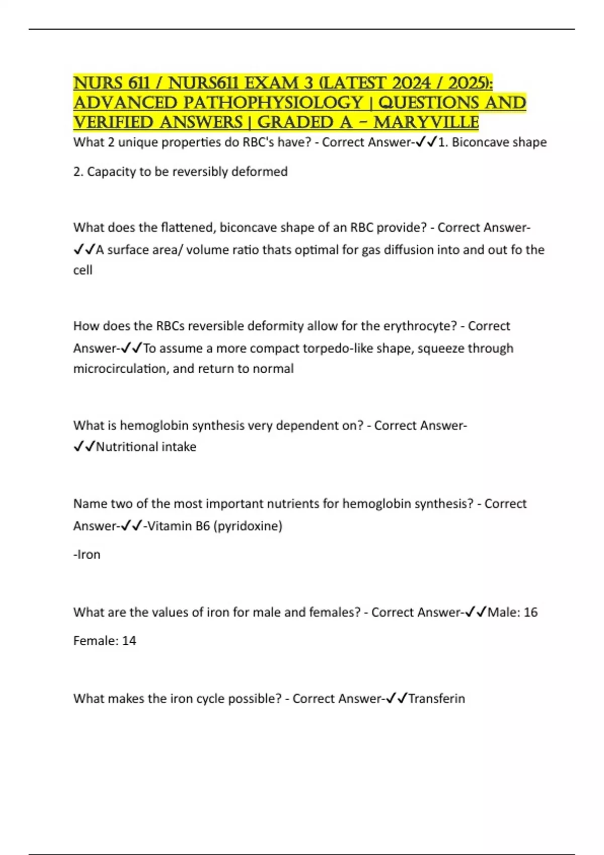 NURS 611 / NURS611 Exam 3 (Latest 2024 / 2025): Advanced Pathophysiology | Questions and Verified Answers | Graded A - Maryville What 2 unique properties do RBC's have? - Correct Answer-1. Biconcave shape 2. Capacity to be reversibly deformed What does the flattened, biconcave shape of an RBC provide? - Correct Answer-A surface area/ volume ratio thats optimal for gas diffusion into and out fo the cell How does the RBCs reversible deformity allow for the erythrocyte? - Correct Answer-To assume a more compact torpedo-like shape, squeeze through microcirculation, and return to normal What is hemoglobin synthesis very dependent on? - Correct Answer-Nutritional intake Name two of the most important nutrients for hemoglobin synthesis? - Correct Answer--Vitamin B6 (pyridoxine) -Iron What are the values of iron for male and females? - Correct Answer-Male: 16 Female: 14 What makes the iron cycle possible? - Correct Answer-Transfering