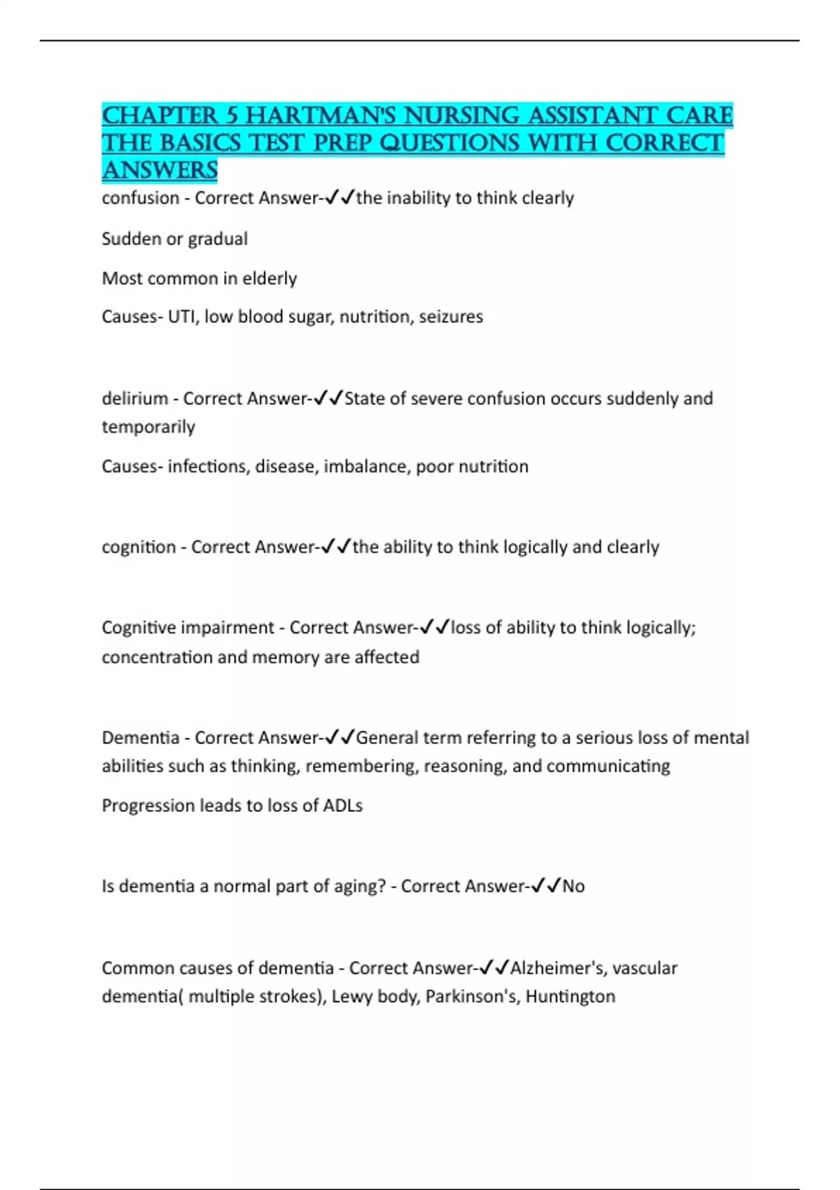 CHAPTER 5 HARTMAN'S NURSING ASSISTANT CARE THE BASICS TEST PREP QUESTIONS WITH CORRECT ANSWERS confusion - Correct Answer-the inability to think clearly Sudden or gradual Most common in elderly Causes- UTI, low blood sugar, nutrition, seizures delirium - Correct Answer-State of severe confusion occurs suddenly and temporarily Causes- infections, disease, imbalance, poor nutrition cognition - Correct Answer-the ability to think logically and clearly Cognitive impairment - Correct Answer-loss of ability to think logically; concentration and memory are affected Dementia - Correct Answer-General term referring to a serious loss of mental abilities such as thinking, remembering, reasoning, and communicating Progression leads to loss of ADLs Is dementia a normal part of aging? - Correct Answer-No Common causes of dementia - Correct Answer-Alzheimer's, vascular dementia( multiple strokes), Lewy body, Parkinson's, Huntington