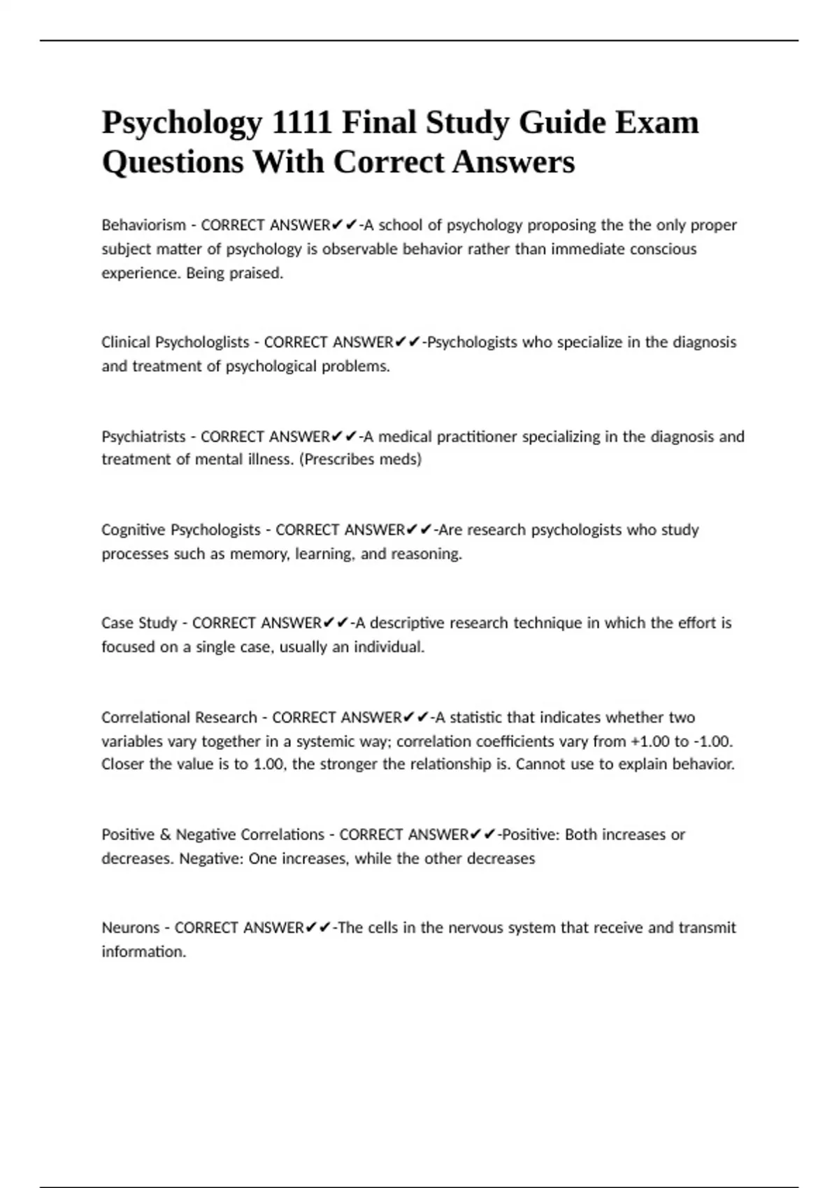 Psychology 1111 Final Study Guide Exam Questions With Correct Answers.