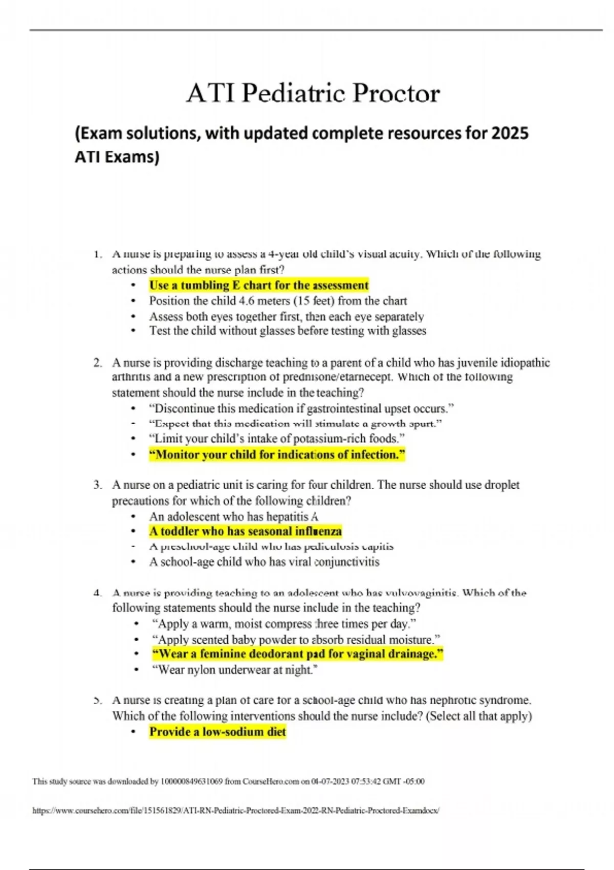 1. A nurse is preparing to assess a 4-year old child’s visual acuity. Which of the following actions should the nurse plan first? • Use a tumbling E chart for the assessment • Position the child 4.6 meters (15 feet) from the chart • Assess both eyes together first, then each eye separately • Test the child without glasses before testing with glasses 2. A nurse is providing discharge teaching to a parent of a child who has juvenile idiopathic arthritis and a new prescription of prednisone/etarnecept. Which of the following statement should the nurse include in the teaching? • “Discontinue this medication if gastrointestinal upset occurs.” • “Expect that this medication will stimulate a growth spurt.” • “Limit your child’s intake of potassium-rich foods.” • “Monitor your child for indications of infection.” 3. A nurse on a pediatric unit is caring for four children. The nurse should use droplet precautions for which of the following children? • An adolescent who has hepatitis A • A toddler who has seasonal influenza • A preschool-age child who has pediculosis capitis • A school-age child who has viral conjunctivitis 4. A nurse is providing teaching to an adolescent who has vulvovaginitis. Which of the following statements should the nurse include in the teaching? • “Apply a warm, moist compress three times per day.” • “Apply scented baby powder to absorb residual moisture.” • “Wear a feminine deodorant pad for vaginal drainage.” • “Wear nylon underwear at night.” 5. A nurse is creating a plan of care for a school-age child who has nephrotic syndrome. Which of the following interventions should the nurse include? (Select all that apply) • Provide a low-sodium diet