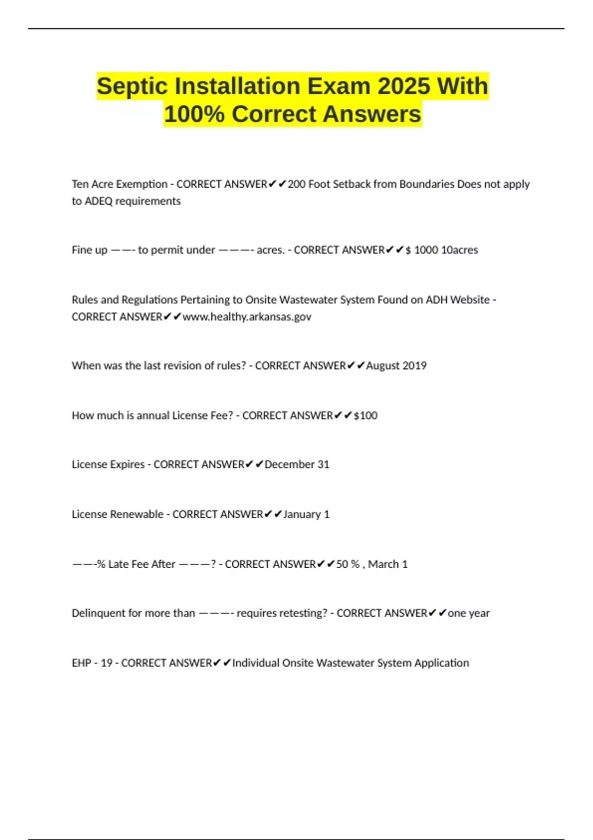 Ten Acre Exemption - CORRECT ANSWER200 Foot Setback from Boundaries Does not apply to ADEQ requirements Fine up ——- to permit under ———- acres. - CORRECT ANSWER$ 1000 10acres Rules and Regulations Pertaining to Onsite Wastewater System Found on ADH Website - CORRECT ANSWER When was the last revision of rules? - CORRECT ANSWERAugust 2019 How much is annual License Fee? - CORRECT ANSWER$100 License Expires - CORRECT ANSWERDecember 31 License Renewable - CORRECT ANSWERJanuary 1 ——-% Late Fee After ———? - CORRECT ANSWER50 % , March 1 Delinquent for more than ———- requires retesting? - CORRECT ANSWERone year EHP - 19 - CORRECT ANSWERIndividual Onsite Wastewater System Application