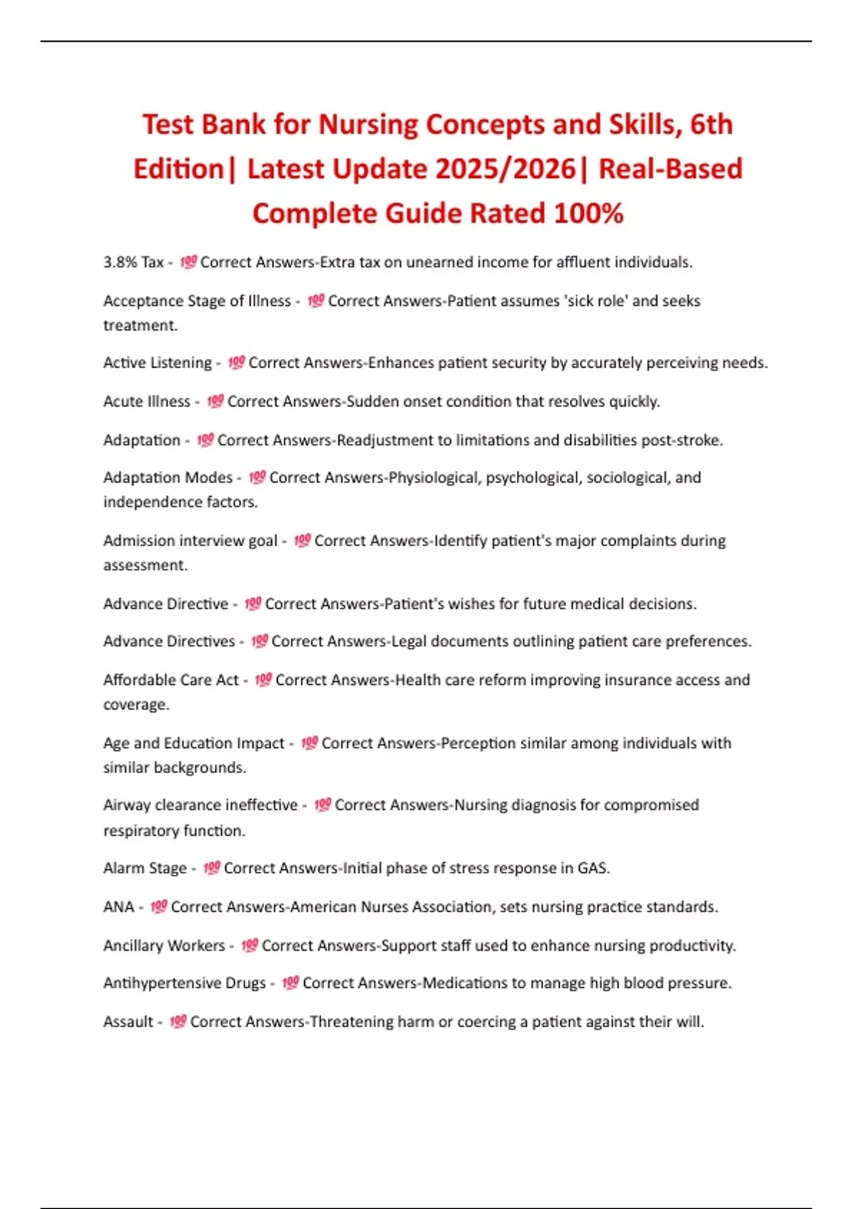 Test Bank for Nursing Concepts and Skills, 6th Edition| Latest Update 2025/2026| Real-Based Complete Guide Rated 100% 3.8% Tax - Correct Answers-Extra tax on unearned income for affluent individuals. Acceptance Stage of Illness - Correct Answers-Patient assumes 'sick role' and seeks treatment. Active Listening - Correct Answers-Enhances patient security by accurately perceiving needs. Acute Illness - Correct Answers-Sudden onset condition that resolves quickly. Adaptation - Correct Answers-Readjustment to limitations and disabilities post-stroke. Adaptation Modes - Correct Answers-Physiological, psychological, sociological, and independence factors. Admission interview goal - Correct Answers-Identify patient's major complaints during assessment. Advance Directive - Correct Answers-Patient's wishes for future medical decisions. Advance Directives - Correct Answers-Legal documents outlining patient care preferences. Affordable Care Act - Correct Answers-Health care reform improving insurance access and coverage. Age and Education Impact - Correct Answers-Perception similar among individuals with similar backgrounds. Airway clearance ineffective - Correct Answers-Nursing diagnosis for compromised respiratory function