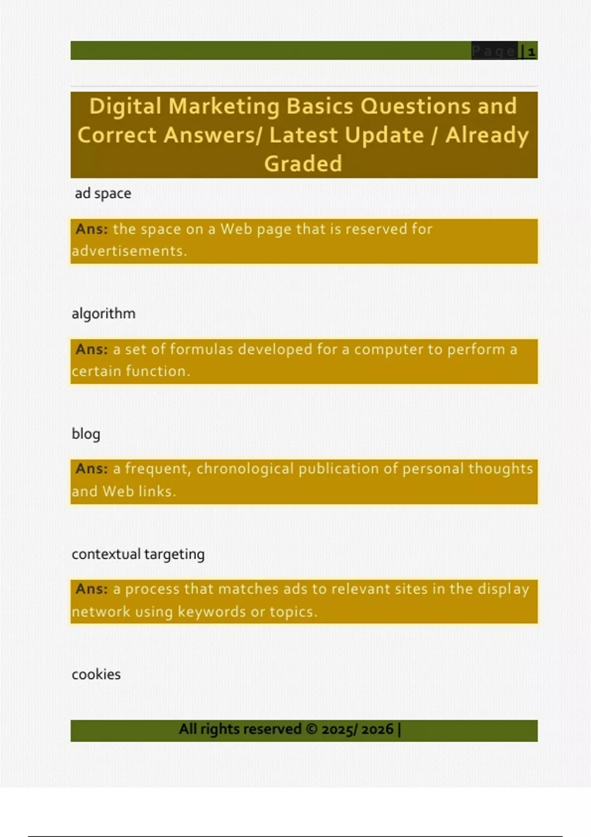 Digital Marketing Basics Questions and Correct Answers/ Latest Update / Already Graded