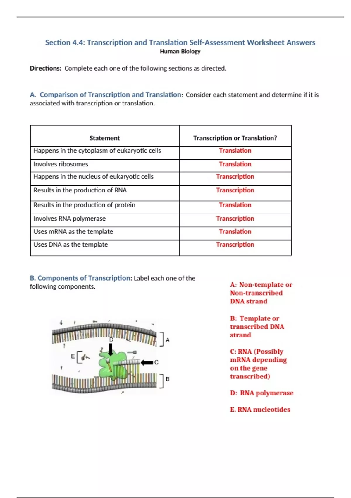 Section 4.4: Transcription and Translation Self-Assessment Worksheet Answers