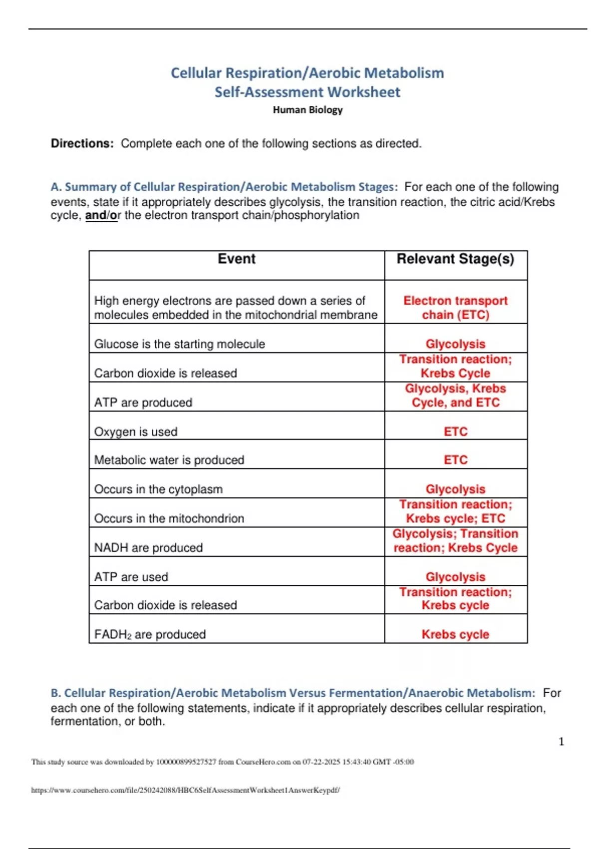 A. Summary of Cellular Respiration/Aerobic Metabolism Stages: For each one of the following