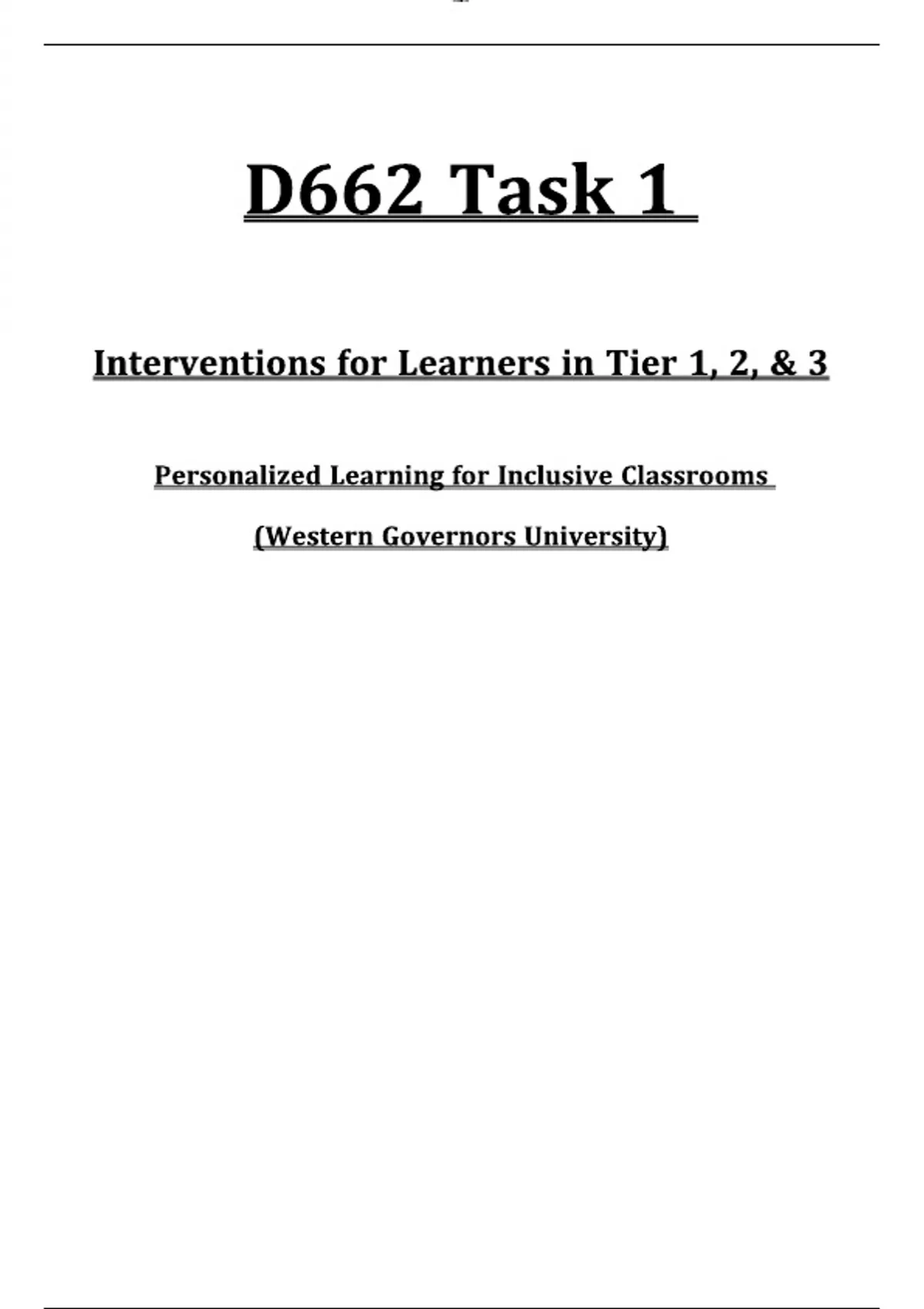 INSTANT DOWNLOAD PDF – This document provides a fully completed and passed *D662 Task 1* for Western Governors University, focused on identifying and explaining appropriate interventions for learners within **Tier 1, Tier 2, and Tier 3** of a Multi-Tiered System of Supports (MTSS). It includes examples of academic and behavioral strategies, data-based decision-making practices, and individualized supports aligned with RTI frameworks. A valuable reference for education students and professionals completing the D662 course. D662 Task 1 WGU, MTSS Tier 1 2 3 interventions, WGU education interventions, RTI strategies example, WGU D662 intervention plan, academic supports for diverse learners, behavioral intervention tiers WGU, Tiered instruction WGU, multi-tiered support system plan, Tier 2 targeted instruction, WGU RTI assignment, differentiated learning strategies WGU, Tier 3 intensive supports, education data tracking WGU, intervention response strategies, D662 passed example PDF, WGU education study help, EON1 Task 1 submission, WGU teaching strategies tiers, WGU MTSS model