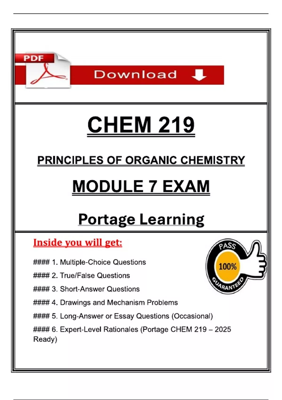 INSTANT DOWNLOAD PDF – This CHEM 219 Module 7 Exam from Portage Learning (2025) features verified questions and answers focused on carboxylic acids and their derivatives. Topics include structure, acidity, naming conventions, nucleophilic acyl substitution, and reactions of acid chlorides, esters, amides, and anhydrides. An essential resource for Portage and Geneva College students completing Module 7 of Principles of Organic Chemistry. CHEM 219, Organic Chemistry Exam, Module 7, Portage Learning, Geneva College, Principles of Organic Chemistry, Organic Chemistry Test, 2025 Chemistry Exam, CHEM 219 Exam, Portage Learning Marketplace, Chemistry Assessment, College Chemistry, Organic Chemistry Questions, Organic Chemistry Concepts, Undergraduate Chemistry, Academic Chemistry Exam, CHEM 219 Portage, College Exam Prep, Study Organic Chemistry, Chemistry Exam 2025, Chemistry Module Exam, University Chemistry Exam, Online Chemistry Course, Chemistry Learning Resources, Chemistry Final Exam, #OrganicChemistry, #CHEM219, #PortageLearning