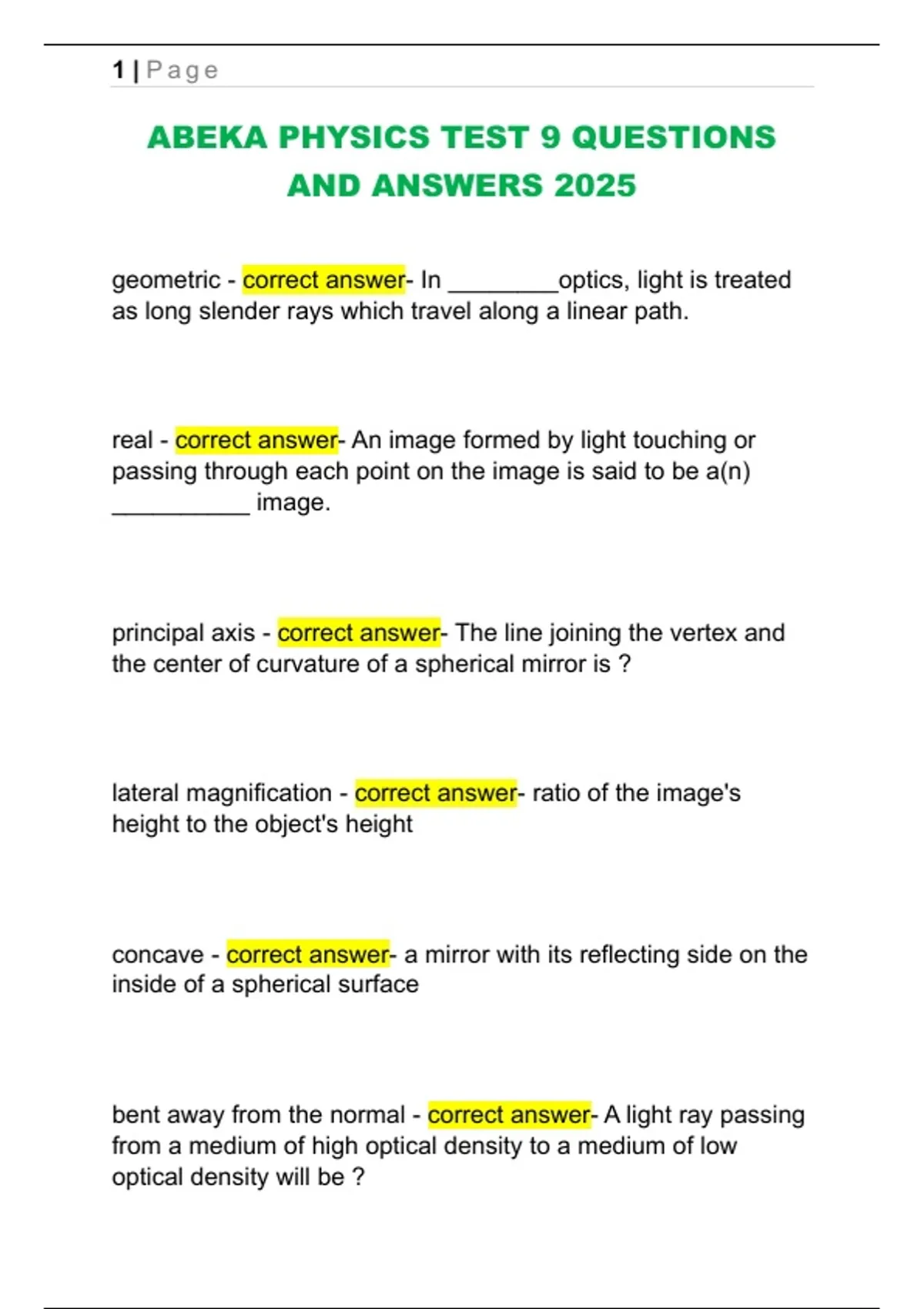 ABEKA PHYSICS TEST 9 QUESTIONS