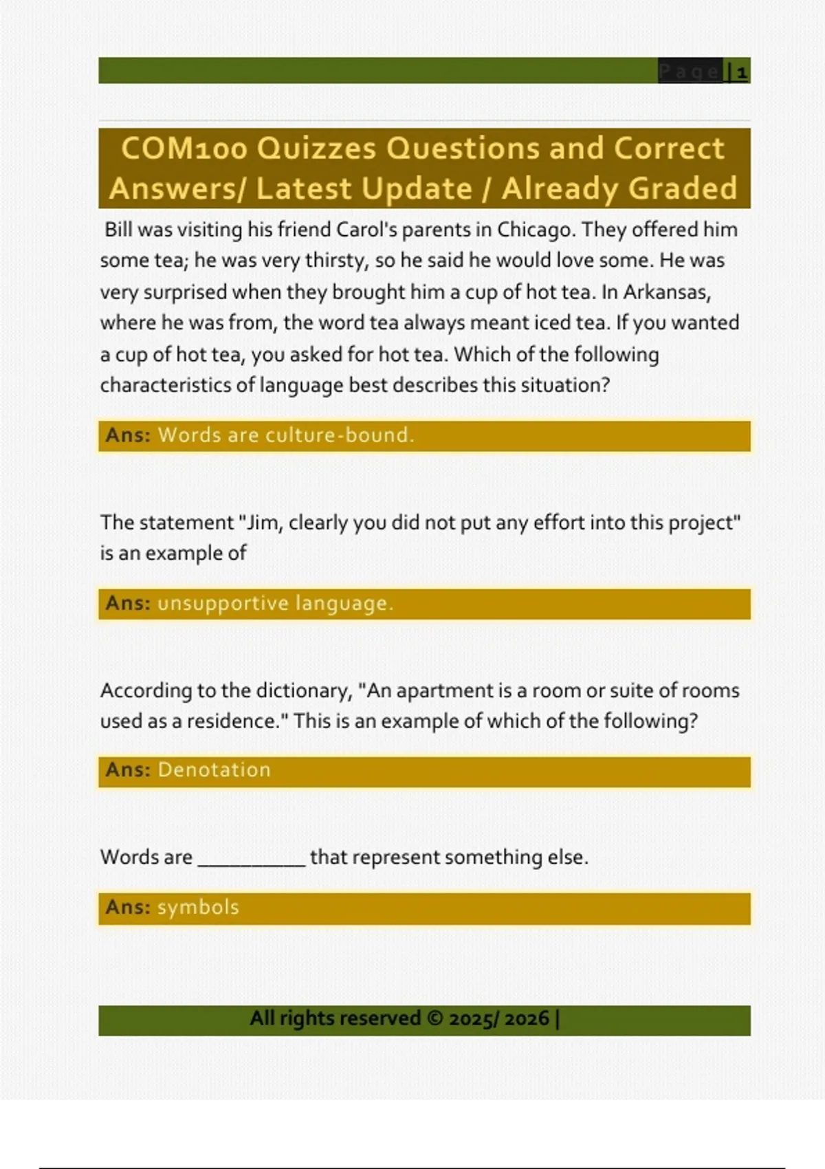 COM100 Quizzes Questions and Correct Answers/ Latest Update / Already Graded