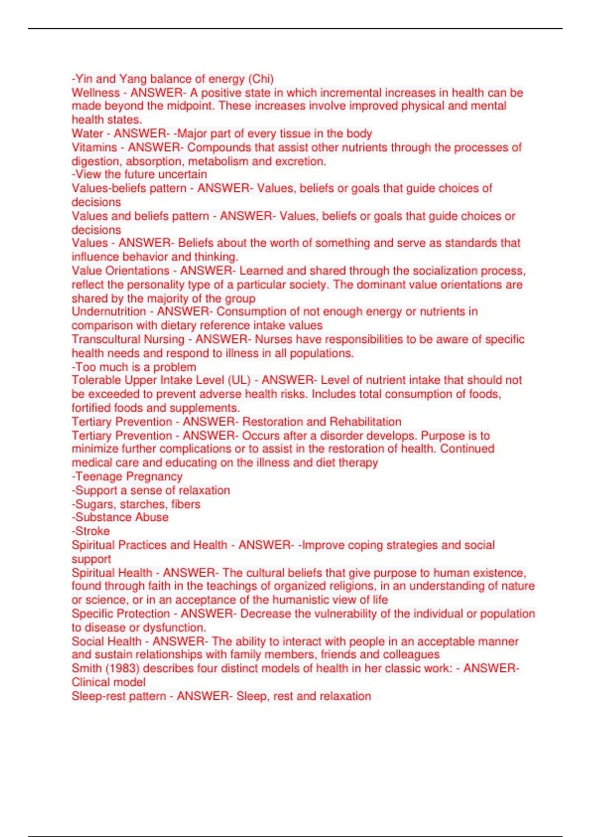 Spiritual Health - ANSWER- The cultural beliefs that give purpose to human existence,
