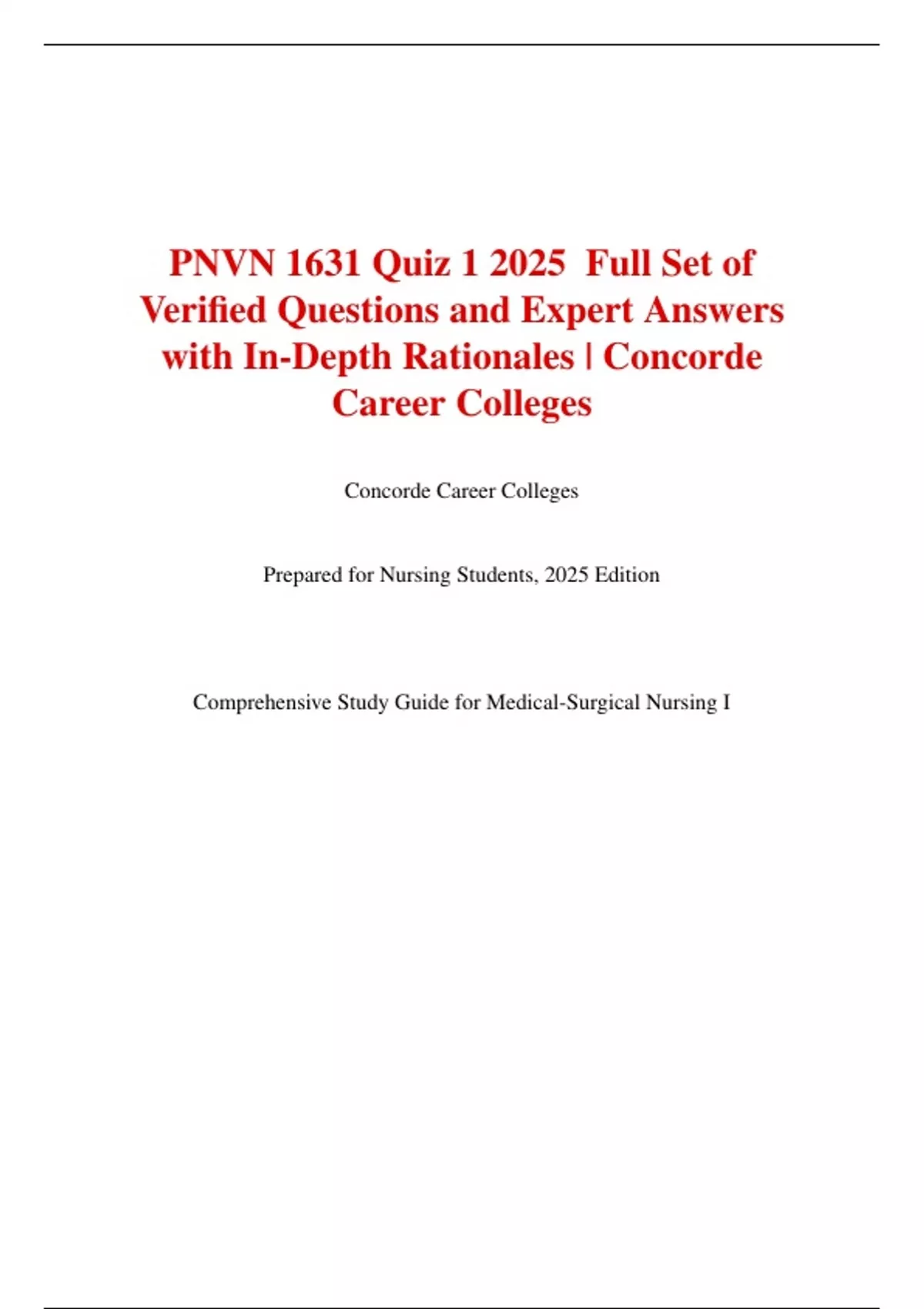 PNVN1631Quiz 1 2025 Full Set of Verified Questions and Expert Answers with In-Depth Rationales | Concorde Career Colleges Concorde Career Colleges Prepared for Nursing Students, 2025 Edition Introduction to PNVN 1631 Quiz 1 This document provides a comprehensive study guide for the PNVN 1631 Quiz 1 at Concorde Career Colleges, focusing on Medical-Surgical Nursing I. It includes 100 verified questions with expert answers and in-depth rationales, covering key topics such as cardiovascular, respiratory, and genitourinary systems, as well as foundational nursing concepts like patient assessment, pathophysiology, and care planning. The content is designed to help students prepare effectively for the quiz by providing clear, concise, and relevant information without unnecessary jargon.