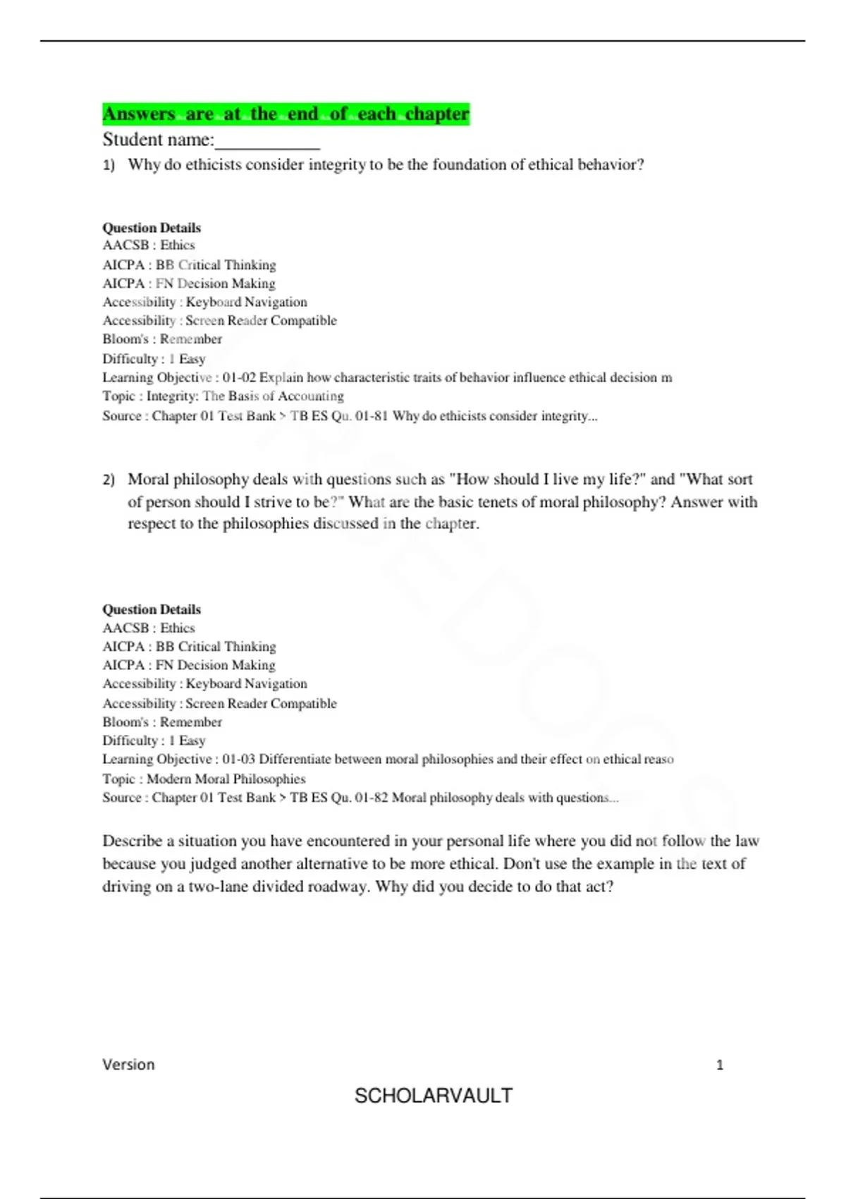 Source : Chapter 01 Test Bank > TB ES Qu. 01-81 Why do ethicists consider integrity...
