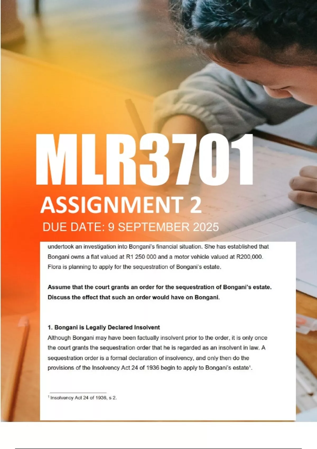 MRL3701 Assignment 2 2025 DUE 9 September 2025 QUESTION: Bongani is experiencing financial difficulty. He has failed to pay his debts over the past few months, and his liabilities have exceeded his assets since 28 October 2024. Bongani owes a total of R2 500 000 to his creditors, including Flora to whom he owes R280 000. Although this debt was due and payable to Flora on 8 January 2024, Bongani failed to pay the debt. Frustrated by not having been paid back, Flora undertook an investigation into Bongani’s financial situation. She has established that Bongani owns a flat valued at R1 250 000 and a motor vehicle valued at R200,000. Flora is planning to apply for the sequestration of Bongani’s estate. Assume that the court grants an order for the sequestration of Bongani’s estate. Discuss the effect that such an order would have on Bongani.