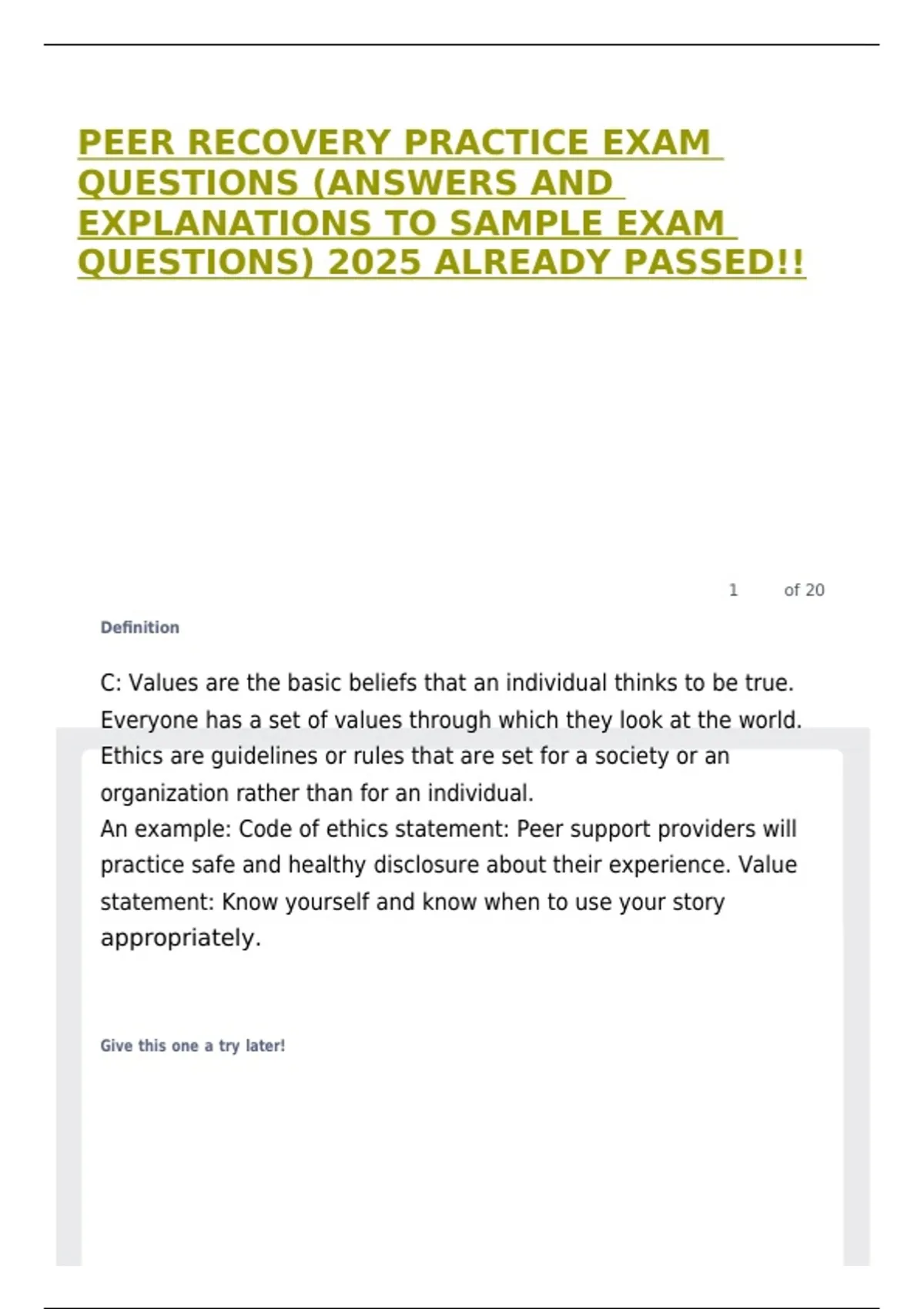 PEER RECOVERY PRACTICE EXAM QUESTIONS (ANSWERS AND EXPLANATIONS TO SAMPLE EXAM QUESTIONS) 2025 ALREADY PASSED!!