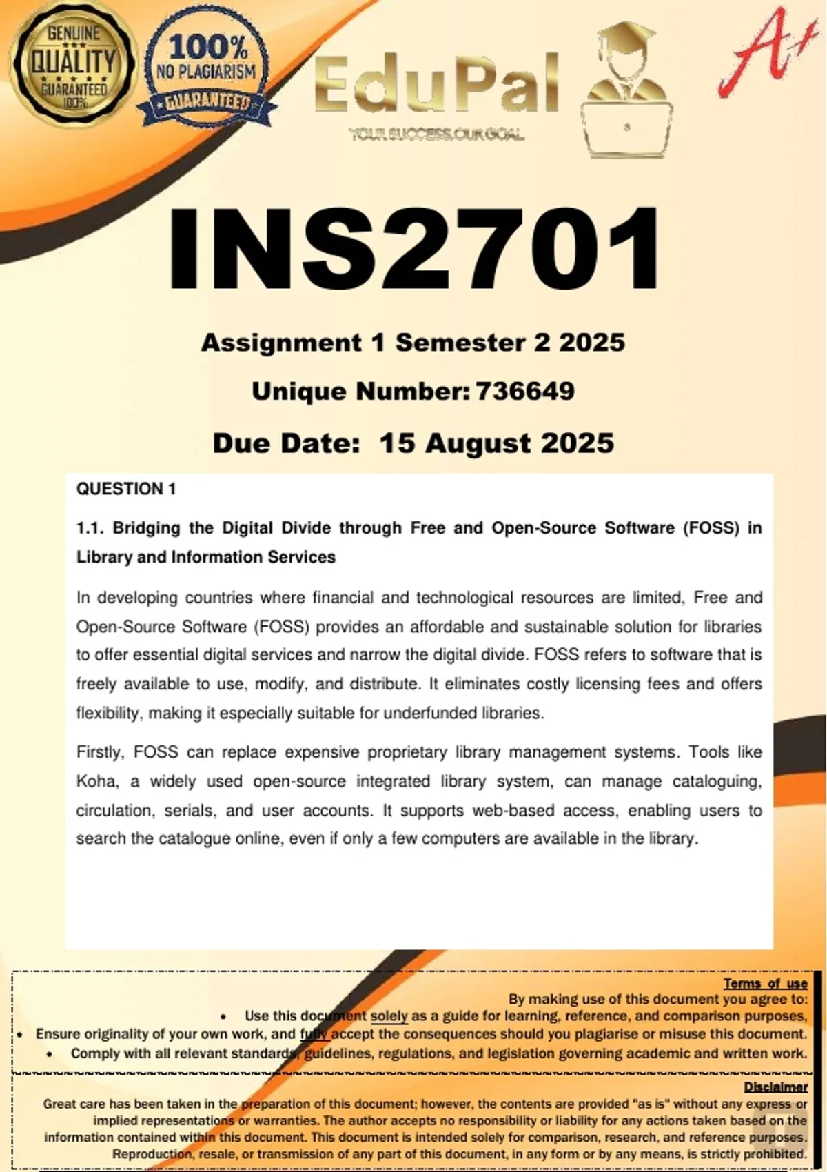 INS2701 Assignment 1 (COMPLETE ANSWERS) Semester 2 2025 (736649) - DUE 15 August 2025; 100% TRUSTED Complete, trusted solutions and explanations. For assistance, Whats-App 0.6.7-1.7.1-1.7.3.9. Ensure your success with us...