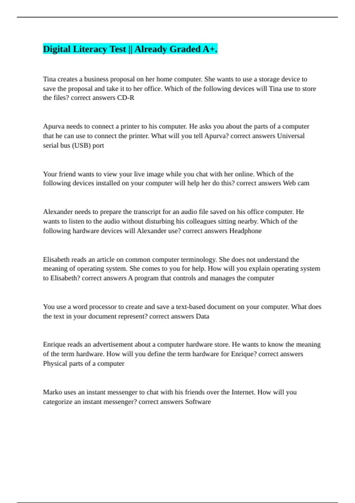 Tina creates a business proposal on her home computer. She wants to use a storage device to save the proposal and take it to her office. Which of the following devices will Tina use to store the files? correct answers CD-R Apurva needs to connect a printer to his computer. He asks you about the parts of a computer that he can use to connect the printer. What will you tell Apurva? correct answers Universal serial bus (USB) port Your friend wants to view your live image while you chat with her online. Which of the following devices installed on your computer will help her do this? correct answers Web cam Alexander needs to prepare the transcript for an audio file saved on his office computer. He wants to listen to the audio without disturbing his colleagues sitting nearby. Which of the following hardware devices will Alexander use? correct answers Headphone Elisabeth reads an article on common computer terminology. She does not understand the meaning of operating system. She comes to you for help. How will you explain operating system to Elisabeth? correct answers A program that controls and manages the computer You use a word processor to create and save a text-based document on your computer. What does the text in your document represent? correct answers Data Enrique reads an advertisement about a computer hardware store. He wants to know the meaning of the term hardware. How will you define the term hardware for Enrique? correct answers Physical parts of a computer Marko uses an instant messenger to chat with his friends over the Internet. How will you categorize an instant messenger? correct answers Software