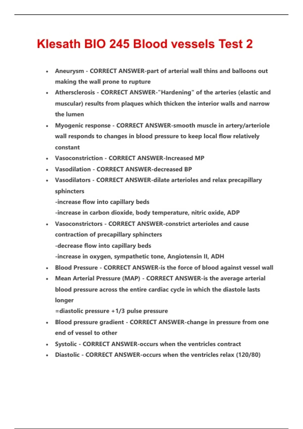 Klesath BIO 245 Blood vessels Test 2 Questions and Answers | 2025 Update | 100% Correct.