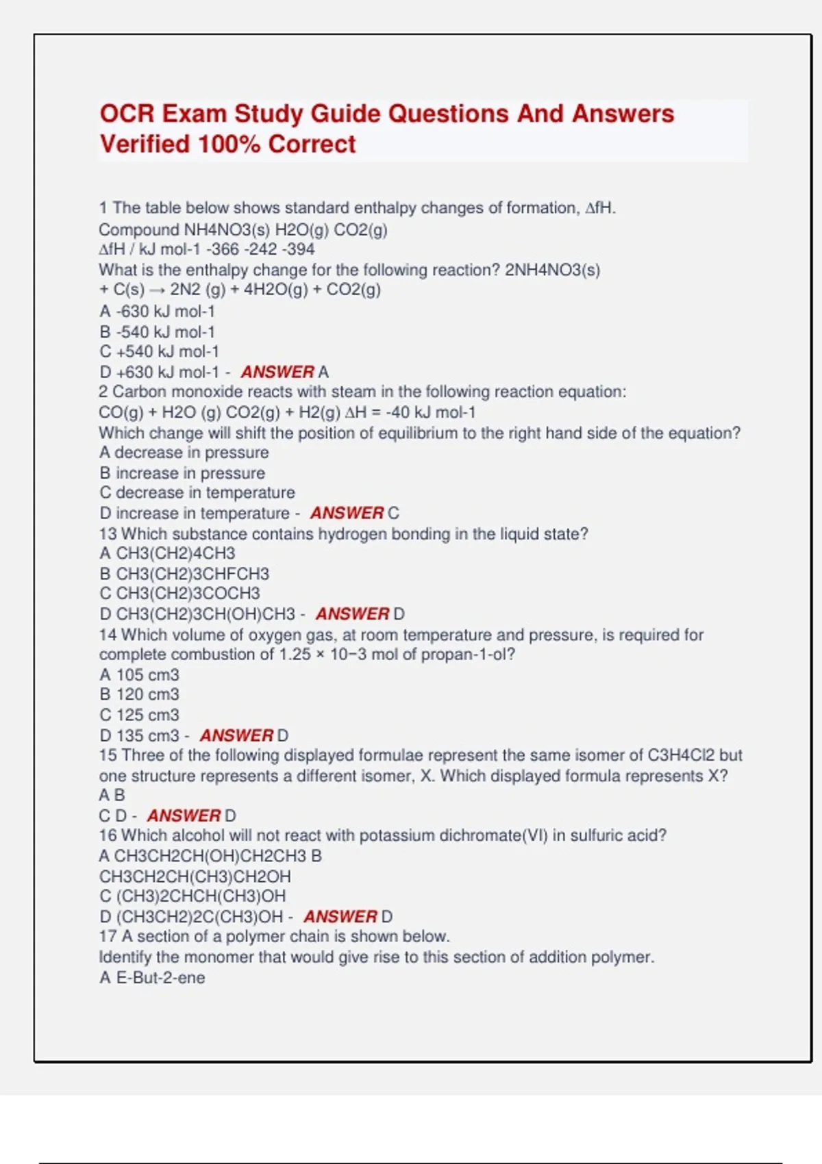 OCR Exam Study Guide Questions And Answers Verified 100% Correct 1 The table below shows standard enthalpy changes of formation, ∆fH. Compound NH4NO3(s) H2O(g) CO2(g) ∆fH / kJ mol-1 -366 -242 -394 What is the enthalpy change for the following reaction? 2NH4NO3(s) + C(s) → 2N2 (g) + 4H2O(g) + CO2(g) A -630 kJ mol-1 B -540 kJ mol-1 C +540 kJ mol-1 D +630 kJ mol-1 - ANSWER A 2 Carbon monoxide reacts with steam in the following reaction equation: CO(g) + H2O (g) CO2(g) + H2(g) ∆H = -40 kJ mol-1 Which change will shift the position of equilibrium to the right hand side of the equation? A decrease in pressure B increase in pressure C decrease in temperature D increase in temperature - ANSWER C 13 Which substance contains hydrogen bonding in the liquid state? A CH3(CH2)4CH3 B CH3(CH2)3CHFCH3 C CH3(CH2)3COCH3 D CH3(CH2)3CH(OH)CH3 - ANSWER D 14 Which volume of oxygen gas, at room temperature and pressure, is required for complete combustion of 1.25 × 10−3 mol of propan-1-ol? A 105 cm3 B 120 cm3 C 125 cm3 D 135 cm3 - ANSWER D 15 Three of the following displayed formulae represent the same isomer of C3H4Cl2 but one structure represents a different isomer, X. Which displayed formula represents X? A B C D - ANSWER D 16 Which alcohol will not react with potassium dichromate(VI) in sulfuric acid? A CH3CH2CH(OH)CH2CH3 B CH3CH2CH(CH3)CH2OH C (CH3)2CHCH(CH3)OH D (CH3CH2)2C(CH3)OH - ANSWER D 17 A section of a polymer chain is shown below. Identify the monomer that would give rise to this section of addition polymer. A E-But-2-ene B Z-But-2-ene C Methylpropene D Propene - ANSWER D 18 (a) A student used the apparatus below in an experiment to determine the enthalpy change of combustion of methanol. The student measured 100 cm3 and poured it into the beaker. The student measured a temperature rise of 10.5 °C. The student calculated the amount of energy transferred to the water. Which of the following uses the appropriate number of significant figures and correct standard form to represent the result of the calculation? A 4.389 × 103 J B 4.39 × 103 J C 43.9 × 102 J D 44.0 × 102 J - ANSWER B 18 (b) The student's calculated enthalpy change was less exothermic than the value in data books. Which of the following errors could have contributed to this result? Error 1: After the final temperature was recorded, the student removed the burner from under the beaker. The flame burnt for a further 5 minutes before weighing the spirit burner. Error 2: The student recorded the final temperature 5 minutes after removing the burner. Error 3: The student spilt some water on the bench when pouring the water from the measuring cylinder into the beaker. A 1, 2 and 3 B Only 1 and 2 C Only 2 and 3 D Only 1 - ANSWER B 19 A student prepares a standard solution and carries out a titration. The standard solution is placed in the burette. Which of the following would result in a titre that is larger than it should be? 1: Water is added to completely fill the volumetric flask, rather than to the graduation line. 2: The conical flask is washed out with water before carrying out each titration. 3: The pipette is washed out with water before carrying out each titration. A 1, 2 and 3 B Only 1 and 2 C Only 2 and 3 D Only 1 - ANSWER D 1 How many electrons are in a 12Mg 24 2+ ion? A 10 B 12 C 14 D 22 Your ANSWER - ANSWER A 2 What is the formula of chromium(III) sulfate? A Cr3SO4 B Cr(SO4)3 C Cr2(SO4)3 D Cr3SO3 Your ANSWER - ANSWER C 3 Which molecule is non-polar? A SF6 B H2S C PF3 D NH3 Your ANSWER - ANSWER A 4 Which row is correct? Highest pH when added to water Most reactive halogen A MgO F2 B MgO I2 C BaO F2 D BaO I2 - ANSWER C 5 Which equation represents a redox reaction? A Mg + 2HCl → MgCl2 + H2 B MgO + 2HCl → H2O + MgCl2 C MgCO3+ 2HCl → CO2 + H2O + MgCl2 D Mg(OH)2 + 2HCl → MgCl2 + 2H2O - ANSWER A 6 This question is about trends in the periodic table. Which trend is correct? A melting point decreases from lithium to carbon B boiling point decreases from fluorine to iodine C first ionisation energy decreases from lithium to caesium D first ionisation energy increases from nitrogen to oxygen - ANSWER C 7 A sample of a compound M contains 1.46 g of carbon, 0.482 g of hydrogen and 1.69 g of nitrogen. What is the empirical formula of M? A CH2N B C4HN4 C CH4N D C2H4N - ANSWER C 8 A student mixes 100 cm3 of 0.200 mol dm-3 NaCl(aq) with 100 cm3 of 0.200 mol dm-3 Na2CO3(aq). What is the total concentration of Na+ ions in the mixture formed? A 0.100 mol dm-3 B 0.200 mol dm-3 C 0.300 mol dm-3 D 0.400 mol dm-3 - ANSWER C 9 Which mass of substance contains the greatest number of atoms? A 3.00 g of ammonia, NH3