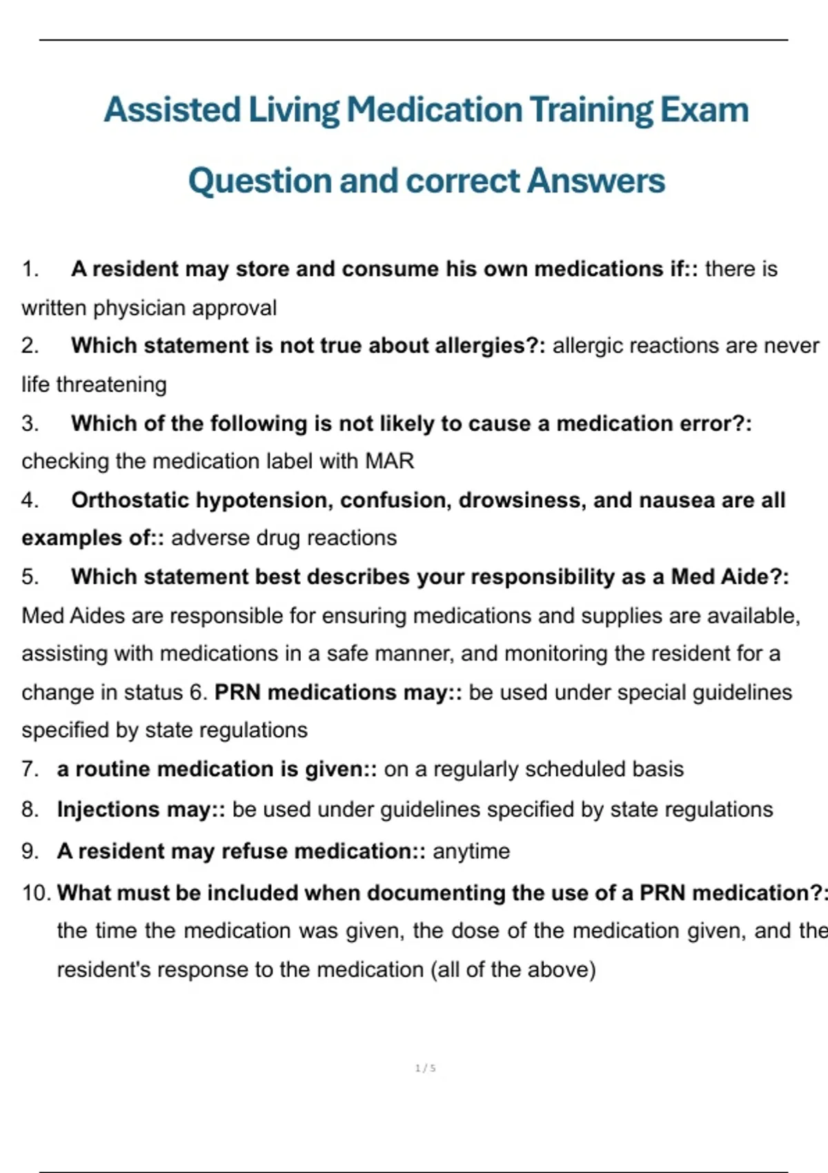 Assisted Living Medication Training 2025 Exam Question and correct Answers rated A