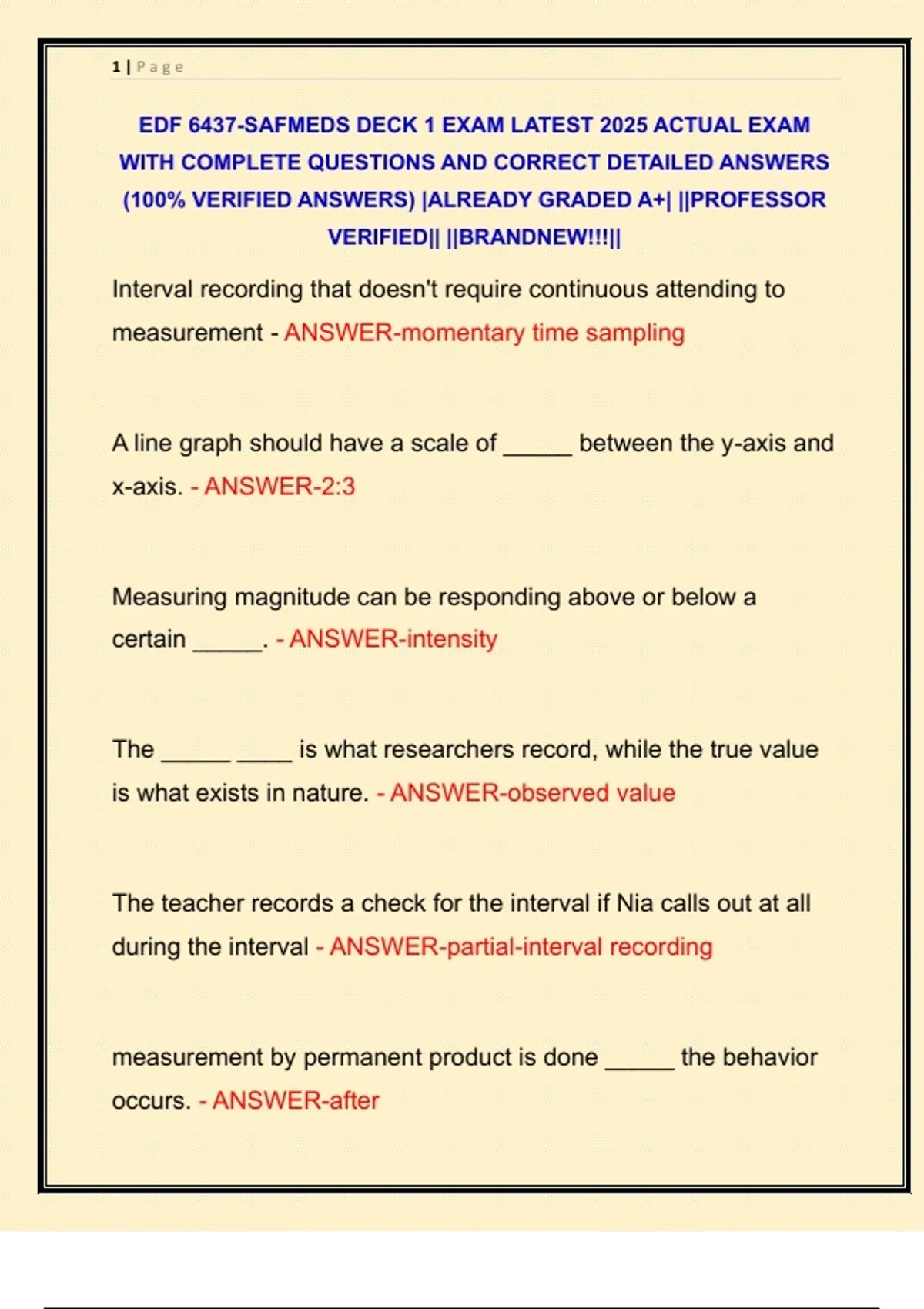 EDF 6437-SAFMEDS DECK 1 EXAM LATEST 2025 ACTUAL EXAM WITH COMPLETE QUESTIONS AND CORRECT DETAILED ANSWERS (100% VERIFIED ANSWERS) |ALREADY GRADED A+| ||PROFESSOR VERIFIED|| ||BRANDNEW!!!||