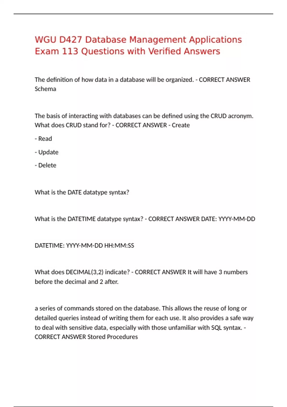 WGU D427 Database Management Applications Exam 113 Questions with Verified Answers The definition of how data in a database will be organized. - CORRECT ANSWER Schema The basis of interacting with databases can be defined using the CRUD acronym. What does CRUD stand for? - CORRECT ANSWER - Create - Read - Update - Delete What is the DATE datatype syntax? What is the DATETIME datatype syntax? - CORRECT ANSWER DATE: YYYY-MM-DD DATETIME: YYYY-MM-DD HH:MM:SS What does DECIMAL(3,2) indicate? - CORRECT ANSWER It will have 3 numbers before the decimal and 2 after. a series of commands stored on the database. This allows the reuse of long or detailed queries instead of writing them for each use. It also provides a safe way to deal with sensitive data, especially with those unfamiliar with SQL syntax. - CORRECT ANSWER Stored Procedures involves instructing the DBMS software on what tables will be in the database, what attributes will be in the tables, which attributes will be indexed, and so forth. - CORRECT ANSWER Data definition language (DDL) refers to the four basic operations that can and must be performed on data stored in any DBMS (or in any other data storage arrangement, for that matter): data retrieval, data update, insertion of new records, and deletion of existing records. - CORRECT ANSWER data manipulation languages (DMLs) What would the SELECT statement look like if you use a BETWEEN. - CORRECT ANSWER SELECT * FROM CUSTOMER WHERE CUSTNUMB BETWEEN 1 AND 2; What would the SELECT statement look like if you use a IN. - CORRECT ANSWER SELECT * FROM CUSTOMER WHERE HQCITY IN ('Atlanta', 'Chicago', 'Washington');