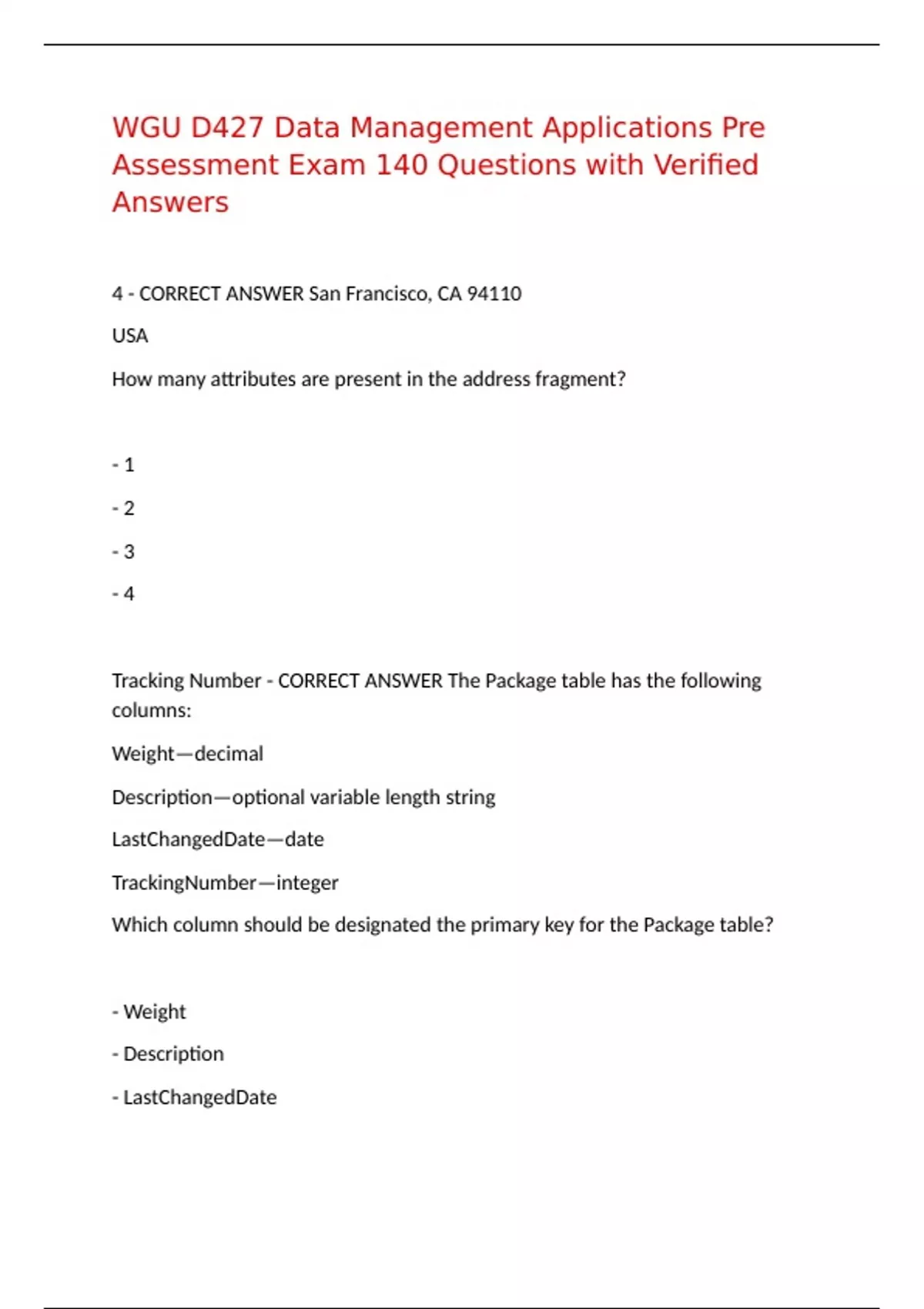 WGU D427 Data Management Applications Pre Assessment Exam 140 Questions with Verified Answers 4 - CORRECT ANSWER San Francisco, CA 94110 USA How many attributes are present in the address fragment? - 1 - 2 - 3 - 4 Tracking Number - CORRECT ANSWER The Package table has the following columns: Weight—decimal Description—optional variable length string LastChangedDate—date TrackingNumber—integer Which column should be designated the primary key for the Package table? - Weight - Description - LastChangedDate - TrackingNumber DATETIME - CORRECT ANSWER Which data type will store ":22:12" as a temporal value without loss of information? - DATE - DATETIME - DECIMAL - BIGINT CREATE, ALTER, OR DROP - CORRECT ANSWER Which SQL command is an example of data definition language (DDL)? - UPDATE - ALTER - SELECT - DELETE The update would be rejected by the database. - CORRECT ANSWER How would a database engine process an update that violates a RESTRICT referential integrity constraint? - The offending value would be set to the database default. - The update would be rejected by the database. - The offending value would be changed to NULL. - The updated value would flow to the primary key. The underlying data must be periodically refreshed. - CORRECT ANSWER Which restriction applies when using a materialized view? - The users of the view must provide search terms. - The underlying data must be periodically refreshed. - The tables referenced in the view must be indexed. - The rows in the table must be compressed.