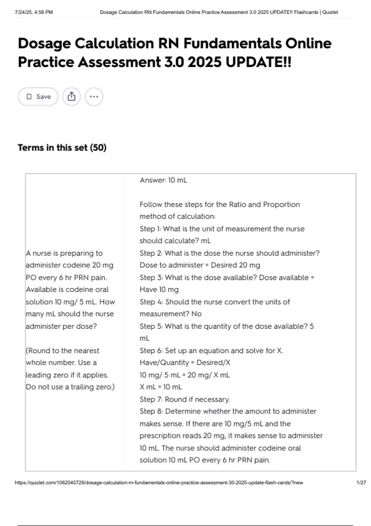 , 7/24/25, 4:58 PM Dosage Calculation RN Fundamentals Online Practice Assessment 3.0 2025 UPDATE!! Flashcards | Quizlet