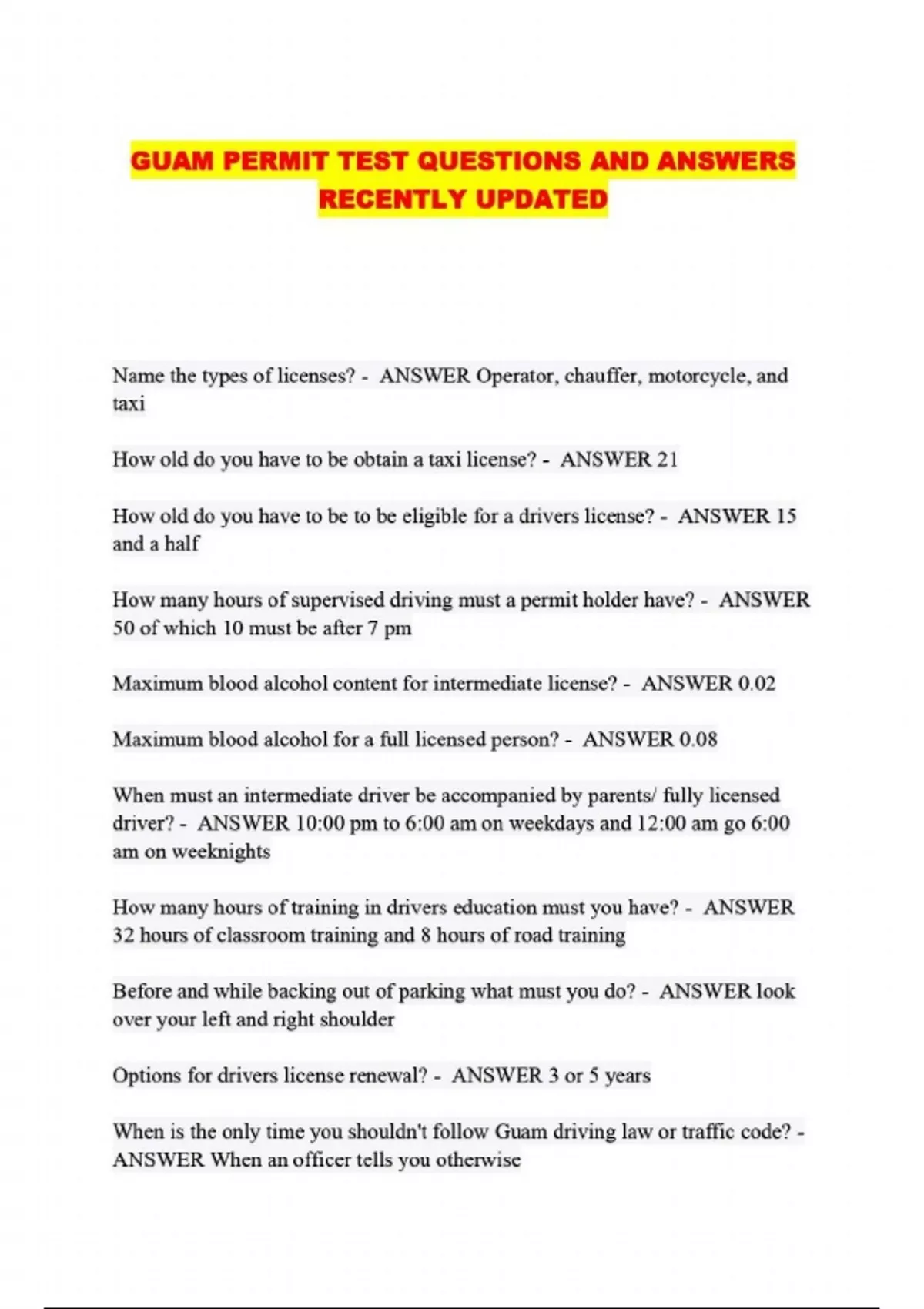 GUAM PERMIT TEST QUESTIONS AND ANSWERS RECENTLY UPDATED