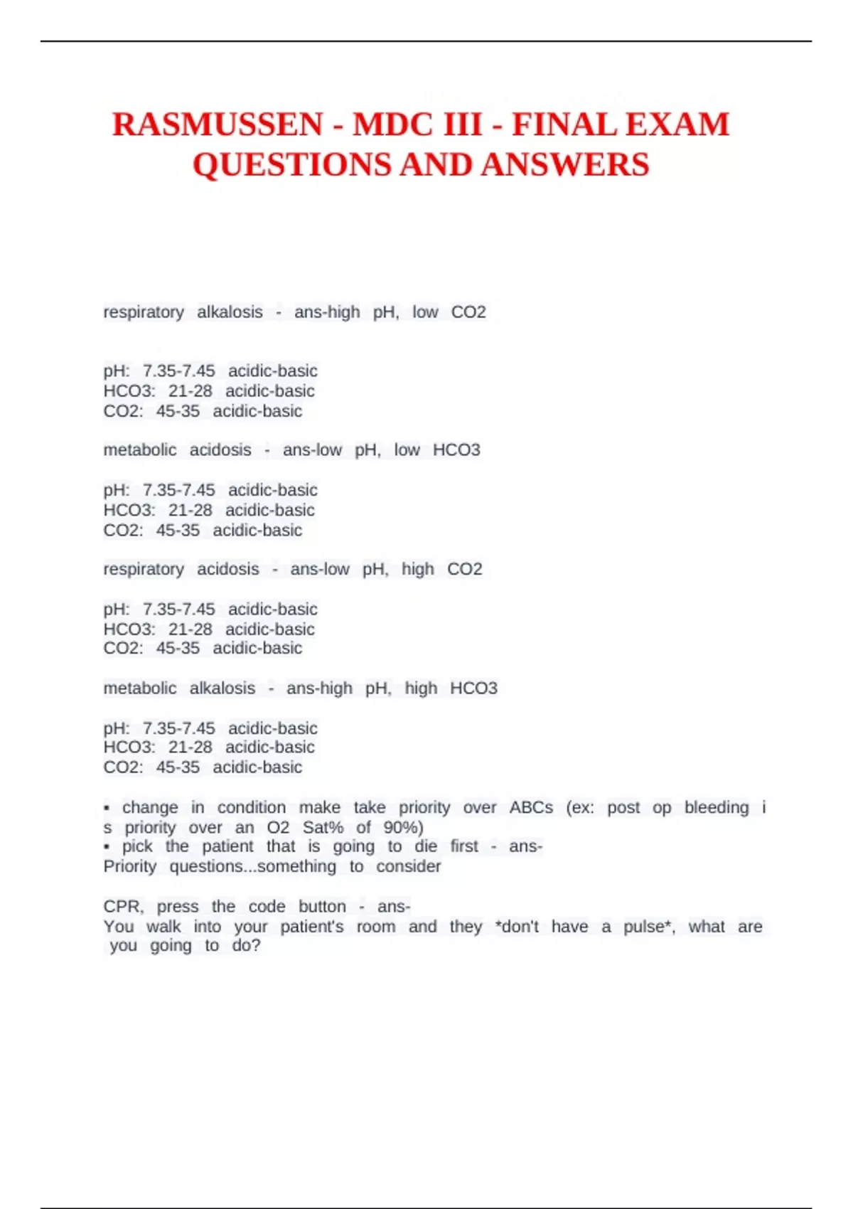 RASMUSSEN - MDC III - FINAL EXAM QUESTIONS AND ANSWERS