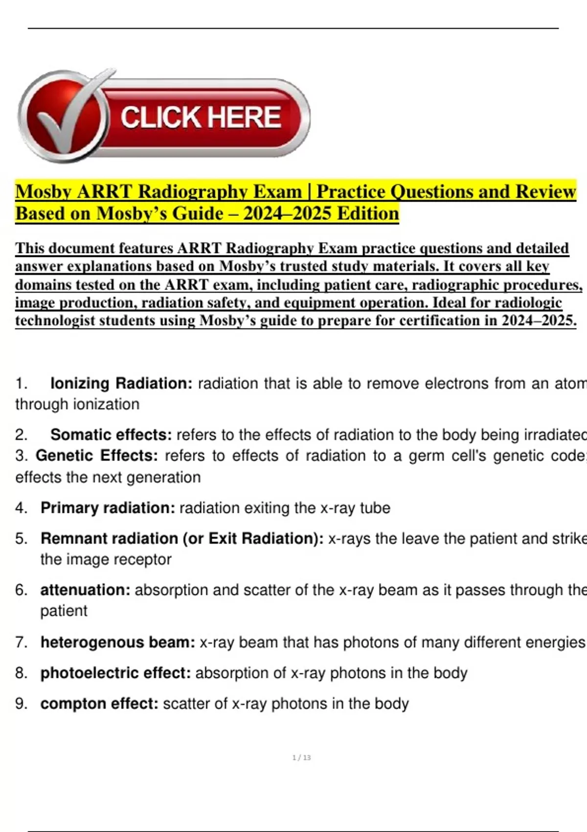 This document features ARRT Radiography Exam practice questions and detailed