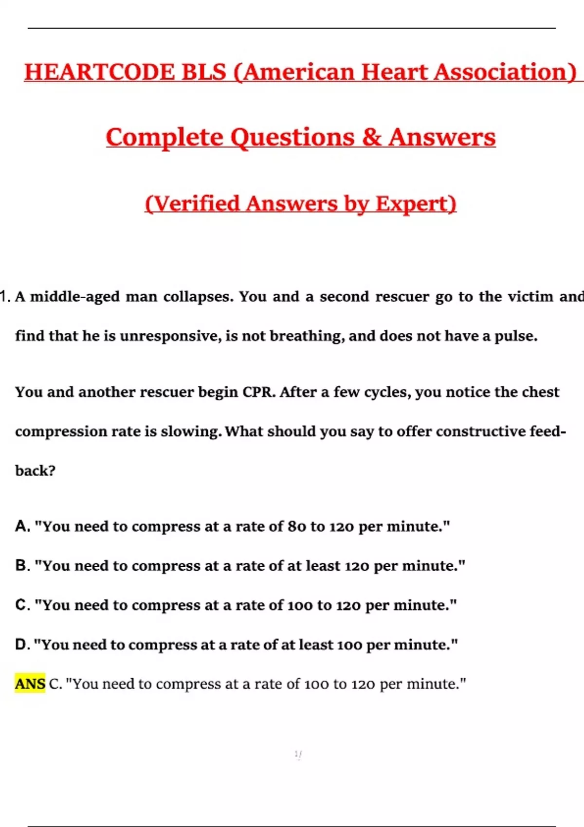 2025 HEARTCODE BLS (American Heart Association) Exam – Complete Questions and Verified Answers | Latest 2025 / 2026 Updated Edition Up-to-date HEARTCODE BLS question and answer set for the 2025/2026 version, verified by medical and CPR experts. Includes complete and accurate solutions to all scenarios and quiz questions, ideal for students, nurses, and healthcare providers preparing for Basic Life Support certification. 2025 HeartCode BLS exam questions with verified answers. Latest HeartCode BLS complete study guide for 2025/2026. Free downloadable HeartCode BLS practice test PDF 2025. American Heart Association HeartCode BLS exam tips 2025. HeartCode BLS instructor resources and materials for 2025. Updated team dynamics scenarios for HeartCode BLS 2025. HeartCode BLS online course review and feedback 2025. Preparing for HeartCode BLS certification exam 2025/2026. HeartCode BLS question bank with expert explanations 2025. Differences between 2024 and 2025 HeartCode BLS exams. HeartCode BLS algorithm changes for 2025 certification. Combining CPR and HeartCode BLS training materials 2025. HeartCode BLS for healthcare providers study strategies 2025. American Heart Association HeartCode BLS updates for 2025. HeartCode BLS exam pass rate and difficulty level 2025. Instant access to HeartCode BLS practice exams 2025 version. HeartCode BLS recertification requirements for 2025/2026. Comprehensive HeartCode BLS question and answer guide 2025. HeartCode BLS instructor-led vs online course comparison 2025. Latest HeartCode BLS guidelines and protocol changes 2025
