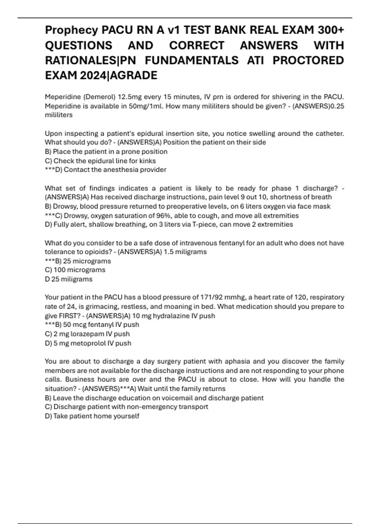 Prophecy PACU RN A v1 TEST BANK REAL EXAM 300+ QUESTIONS AND CORRECT ANSWERS WITH RATIONALES|PN FUNDAMENTALS ATI PROCTORED EXAM 2024|AGRADE
