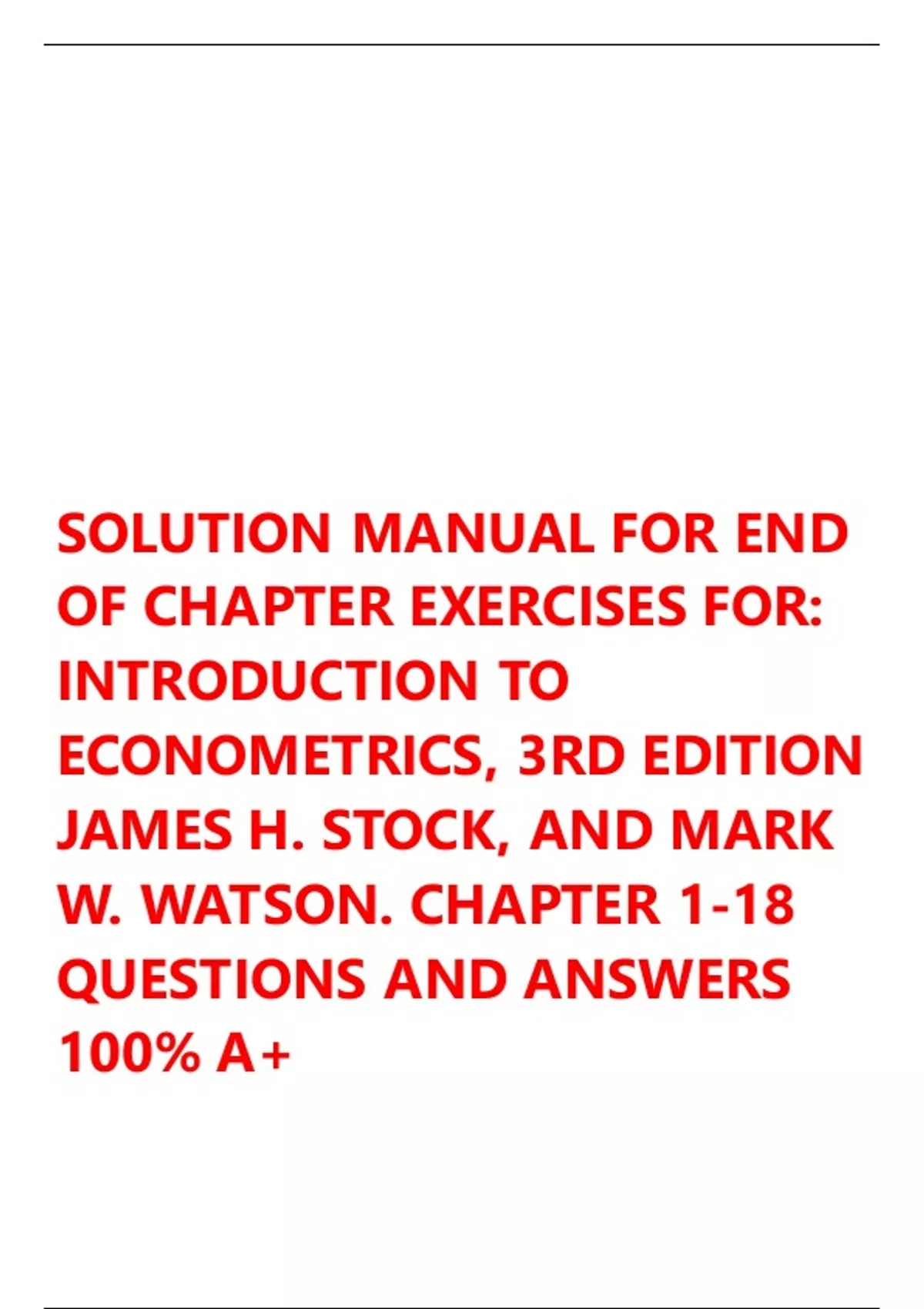 SOLUTION MANUAL FOR END OF CHAPTER EXERCISES FOR: INTRODUCTION TO ECONOMETRICS, 3RD EDITION JAMES H. STOCK, AND MARK W. WATSON. CHAPTER 1-18 QUESTIONS AND ANSWERS 100% A+