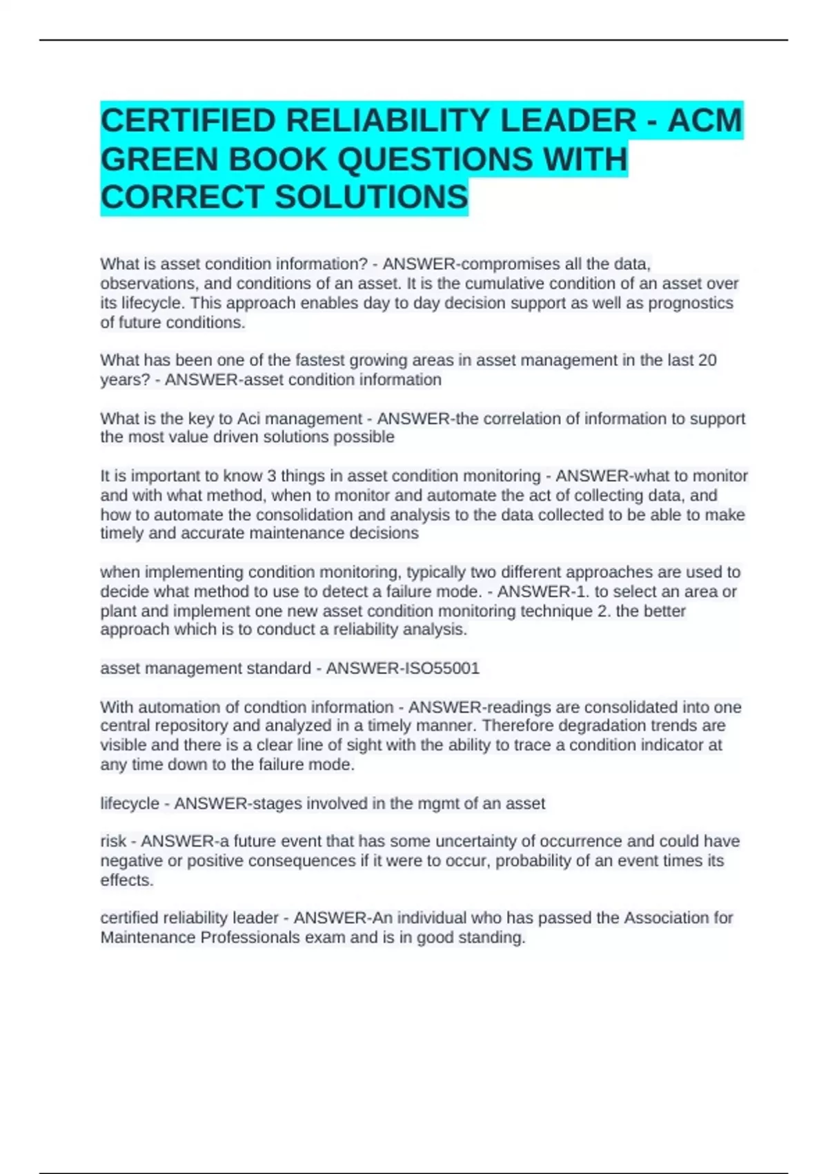 CERTIFIED RELIABILITY LEADER - ACM GREEN BOOK QUESTIONS WITH CORRECT SOLUTIONSCERTIFIED RELIABILITY LEADER - ACM GREEN BOOK QUESTIONS WITH CORRECT SOLUTIONSCERTIFIED RELIABILITY LEADER - ACM GREEN BOOK QUESTIONS WITH CORRECT SOLUTIONS What is asset condition information? - ANSWER-compromises all the data, observations, and conditions of an asset. It is the cumulative condition of an asset over its lifecycle. This approach enables day to day decision support as well as prognostics of future conditions. What has been one of the fastest growing areas in asset management in the last 20 years? - ANSWER-asset condition information What is the key to Aci management - ANSWER-the correlation of information to support