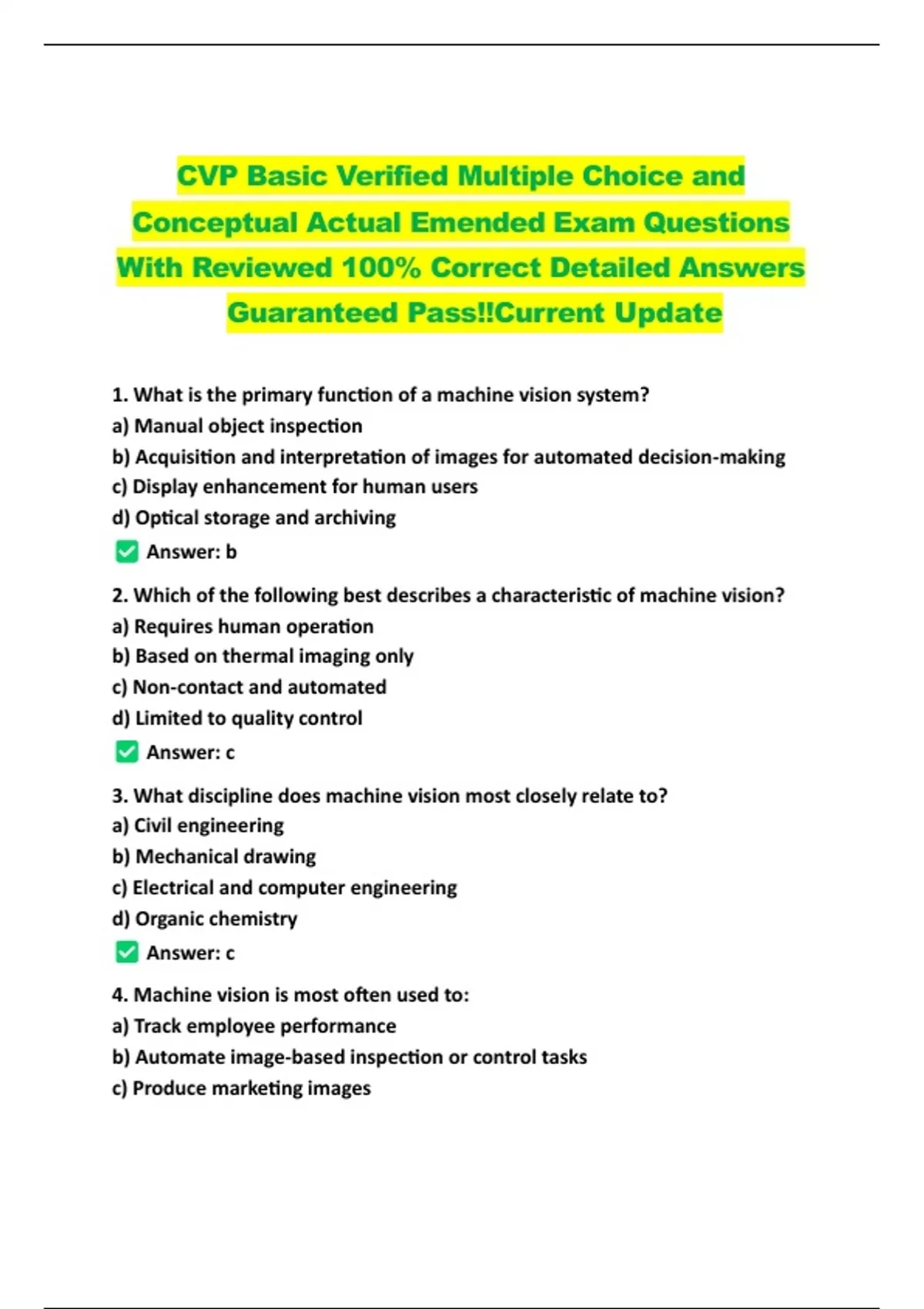 CVP Basic Verified Multiple Choice and Conceptual Actual Emended Exam Questions With Reviewed 100% Correct Detailed Answers Guaranteed Pass!!Current Update 1. What is the primary function of a machine vision system? a) Manual object inspection b) Acquisition and interpretation of images for automated decision-making c) Display enhancement for human users d) Optical storage and archiving Answer: b 2. Which of the following best describes a characteristic of machine vision? a) Requires human operation b) Based on thermal imaging only c) Non-contact and automated d) Limited to quality control Answer: c 3. What discipline does machine vision most closely relate to? a) Civil engineering b) Mechanical drawing c) Electrical and computer engineering d) Organic chemistry Answer: c 4. Machine vision is most often used to: a) Track employee performance b) Automate image-based inspection or control tasks c) Produce marketing images d) Enhance video streaming Answer: b 5. Which component is essential for capturing visual data in machine vision? a) Processor b) Lens c) Microphone d) Monitor Answer: b